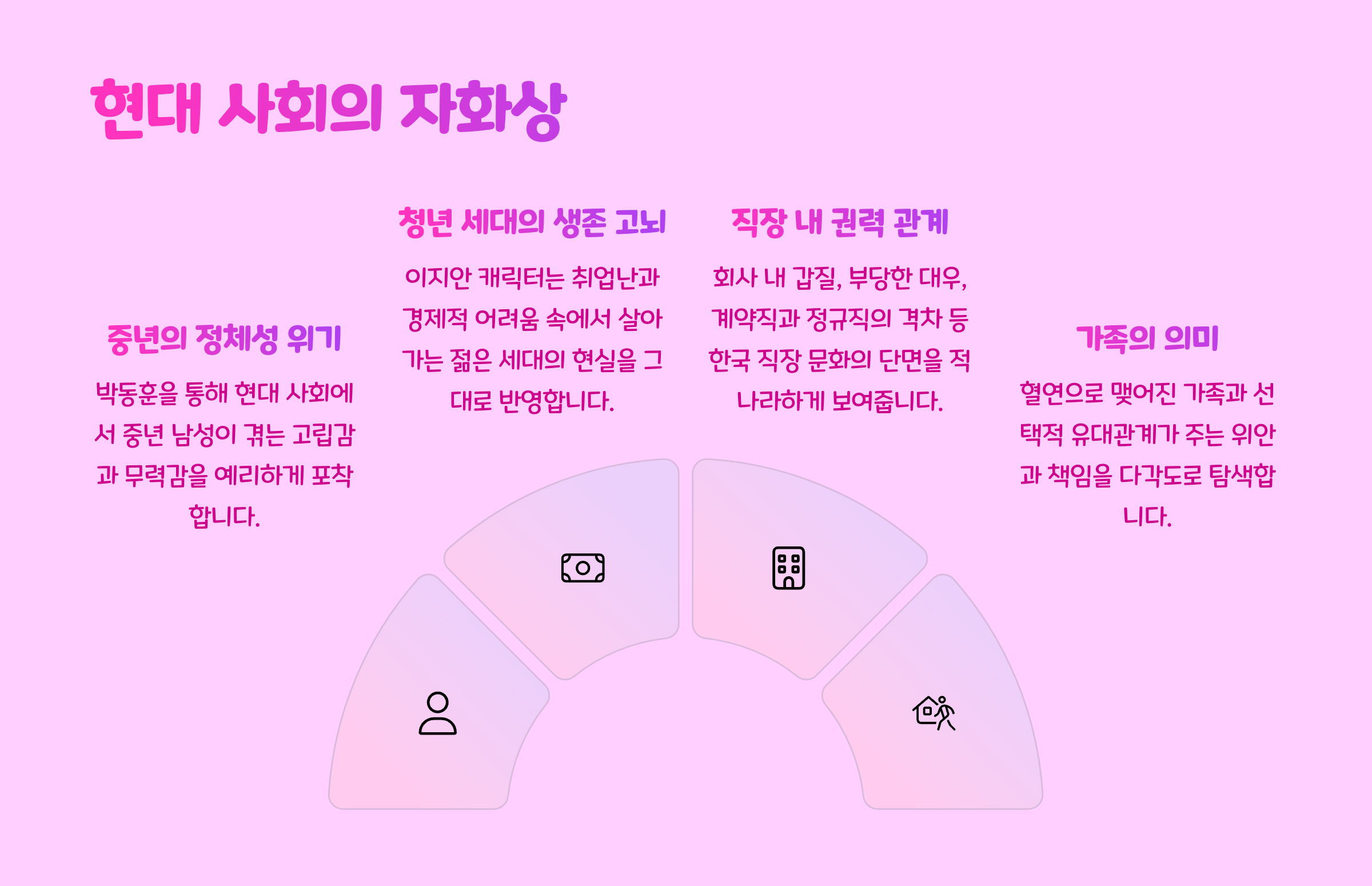 박동훈은 많은 한국의 중년 남성을 상징하는 인물입니다. 사회적으로는 성공한 듯 보이지만, 그는 깊은 외로움과 정체성의 혼란을 겪습니다. 아내의 불륜, 직장 내 권력 다툼, 친구들과의 거리감은 그를 더욱 고립시키고, 그는 감정을 억누른 채 침묵을 선택합니다. 하지만 그 침묵 속에는 무너진 자존감과 인간으로서의 흔들림이 존재합니다. 결국 그는 이지안을 통해 자신의 감정을 다시 꺼내고, 진정한 자아를 마주하게 됩니다.