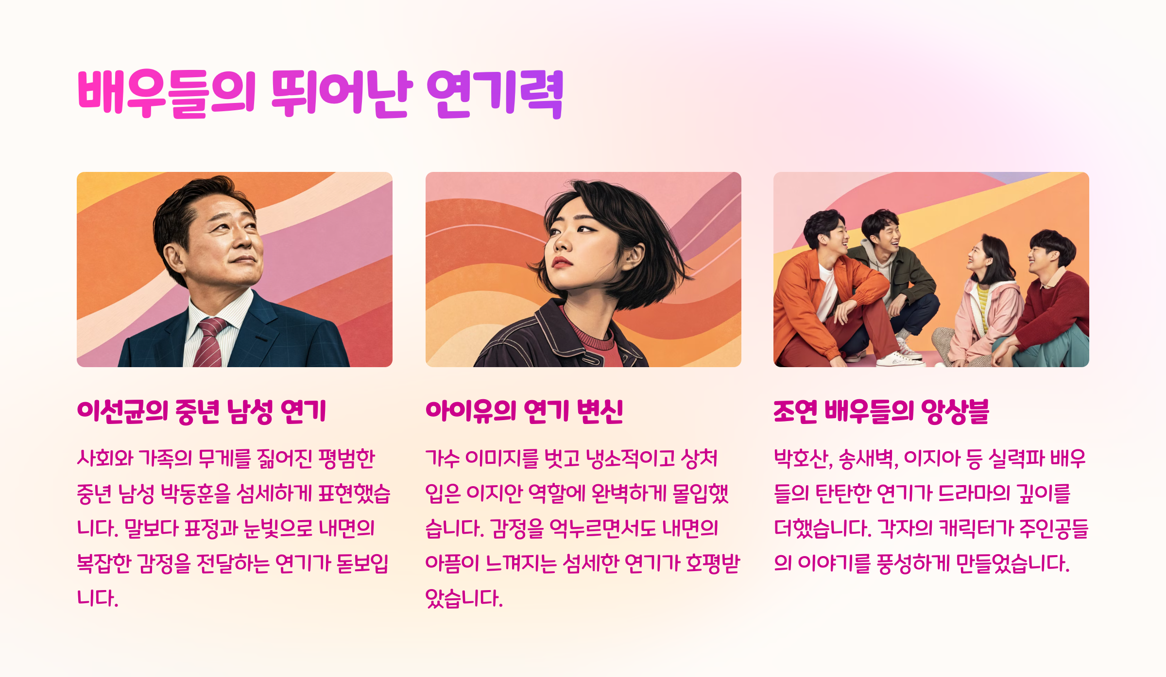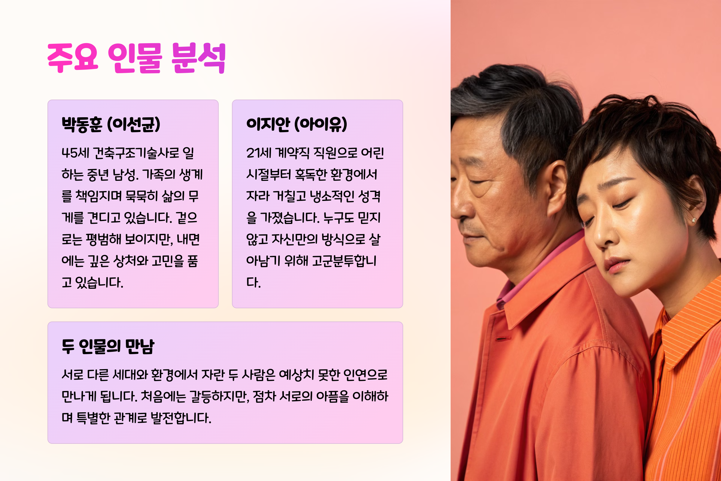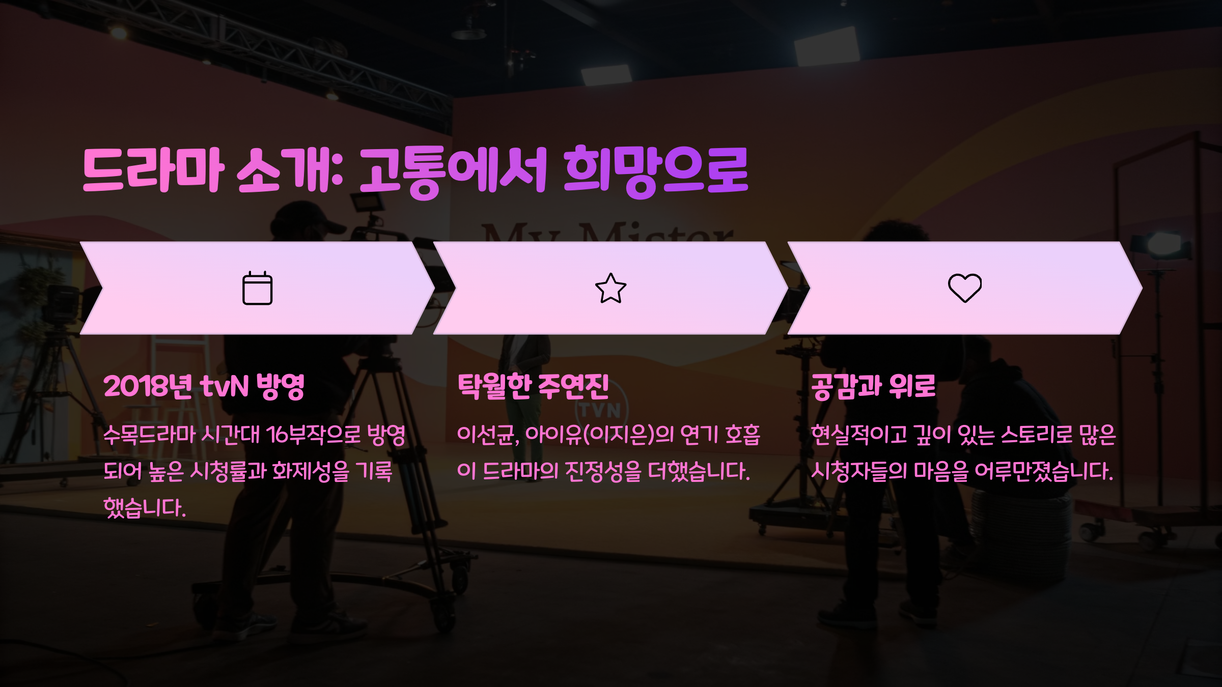 ‘나의 아저씨’는 고통받는 두 인물이 만나 서로를 통해 상처를 치유하고, 존재의 의미를 재발견하는 과정을 담은 드라마입니다. 특히 이 작품은 중년의 정체성 위기, 젊은 세대의 생존 고뇌, 인간관계의 복잡성 등 현대 사회가 안고 있는 문제들을 깊이 있고 현실적으로 다루며, 단순한 위로를 넘어서는 성찰을 선사합니다. 정적인 연출과 내면 중심의 대사는 시청자들의 몰입도를 높였고, 이지은과 박해일의 연기 또한 극의 진정성을 극대화했습니다.