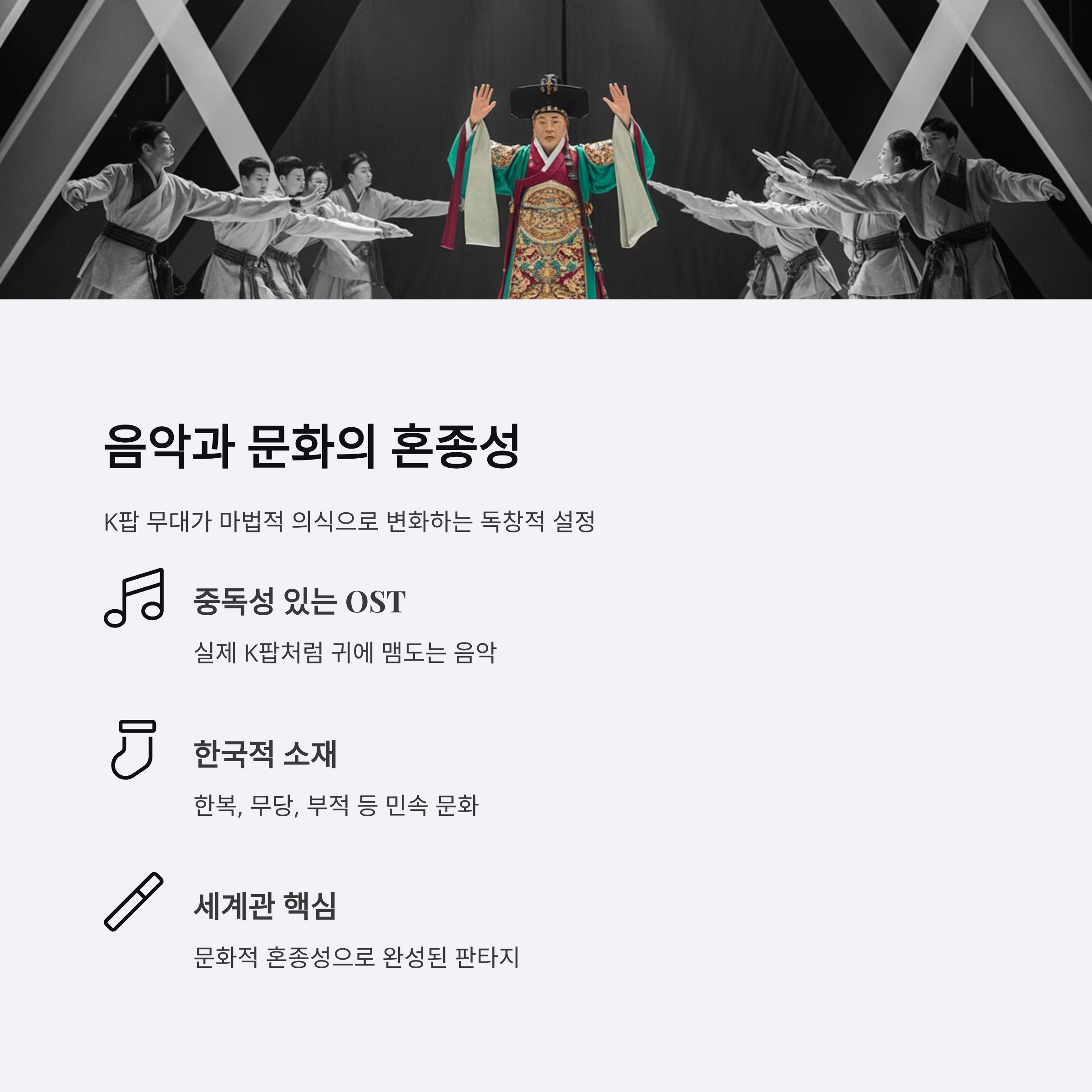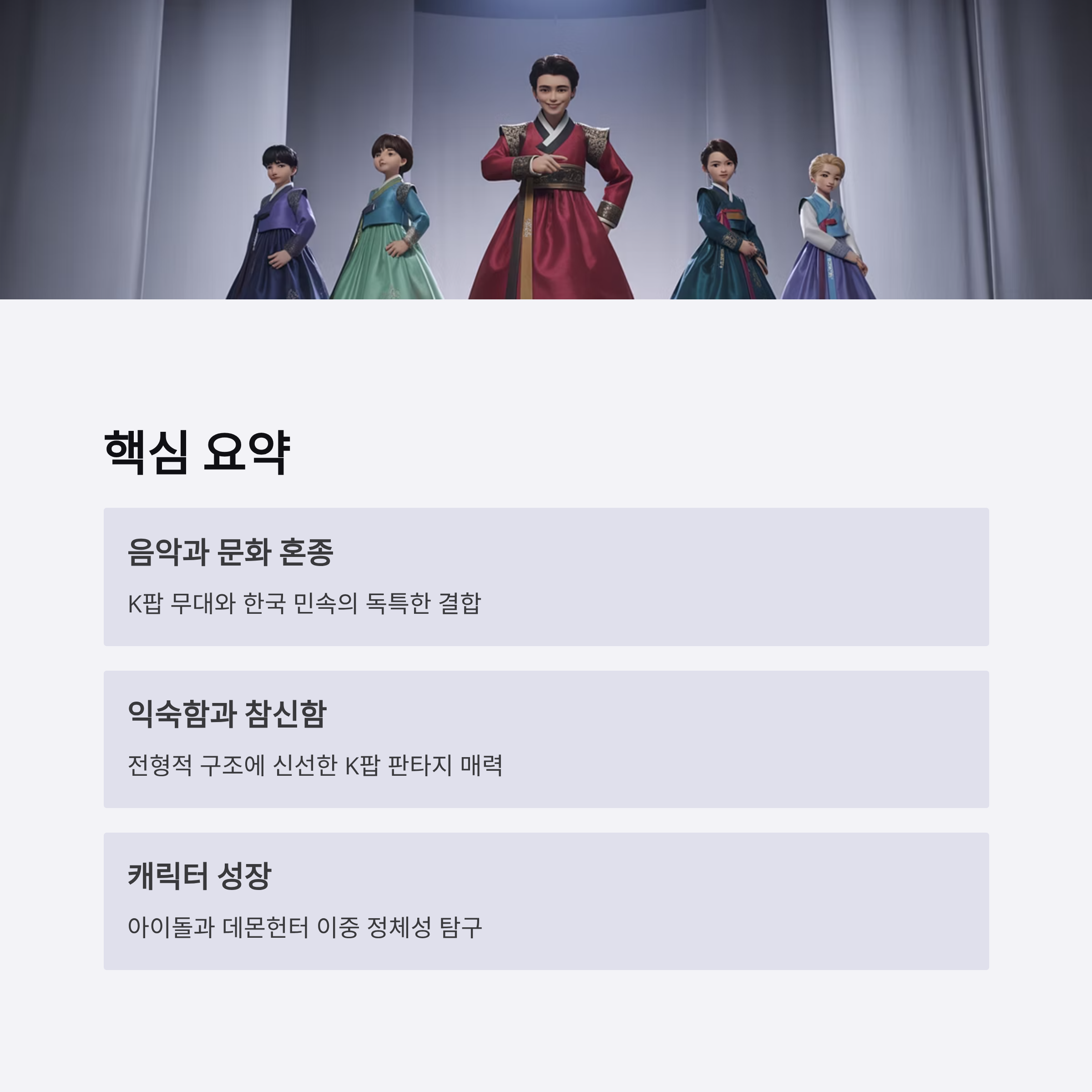 - 🎶 음악과 문화 혼종: K팝 무대와 한국 민속이 결합해 독특한 세계관과 시각적 스타일을 형성한다.