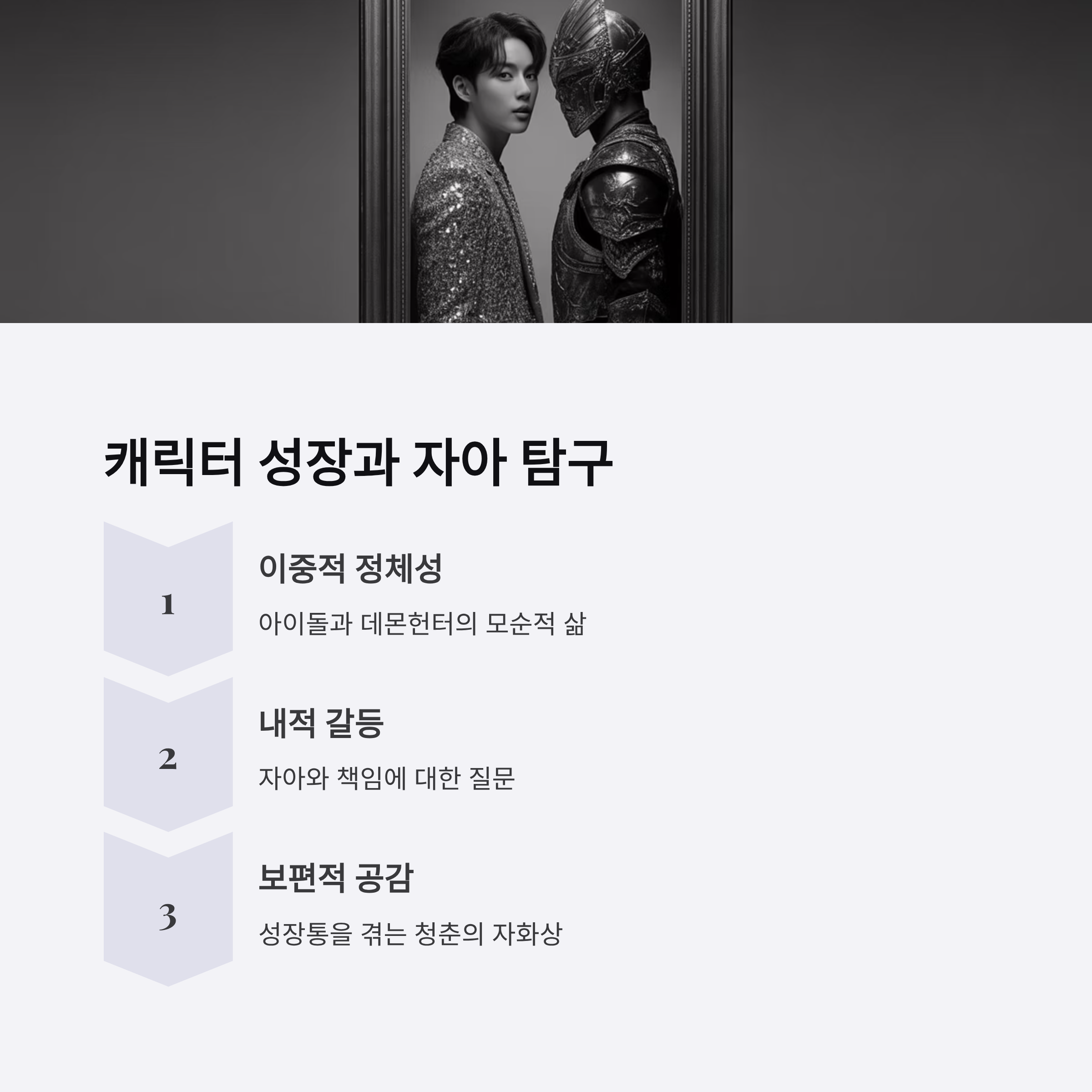 - 🌌 캐릭터 성장 서사: 아이돌이자 데몬헌터로서의 이중적 삶이 ‘정체성, 자아, 책임’이라는 보편적 주제를 담는다.