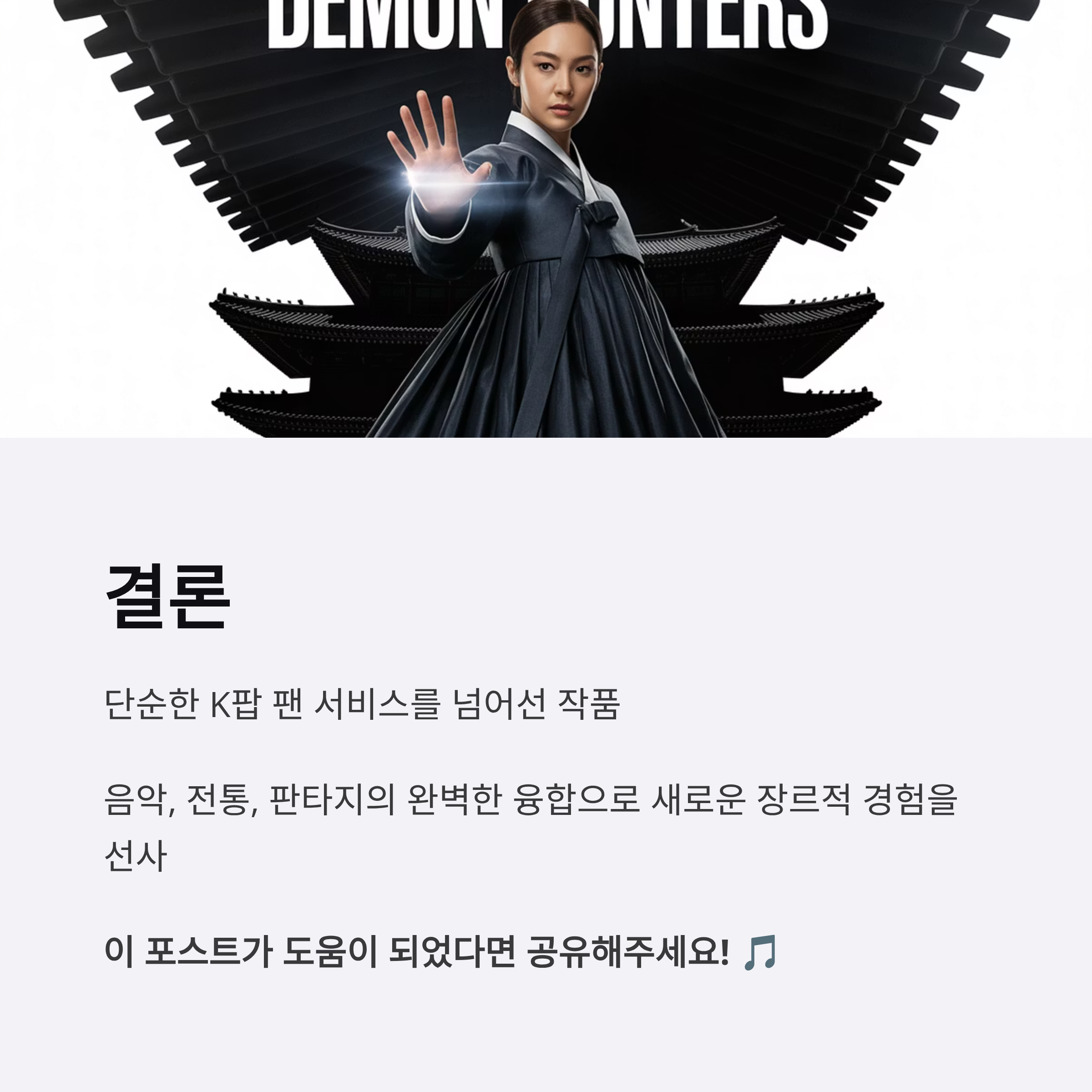 <K팝 데몬헌터스>는 단순한 아이돌 애니메이션을 넘어, 음악과 전통 문화, 판타지를 융합한 새로운 시도를 보여준다. 이 영화는 익숙한 장르적 구조와 클리셰를 기반으로 하면서도, K팝이라는 글로벌 코드와 한국적 디테일을 결합하여 독창적인 매력을 만들어냈다.