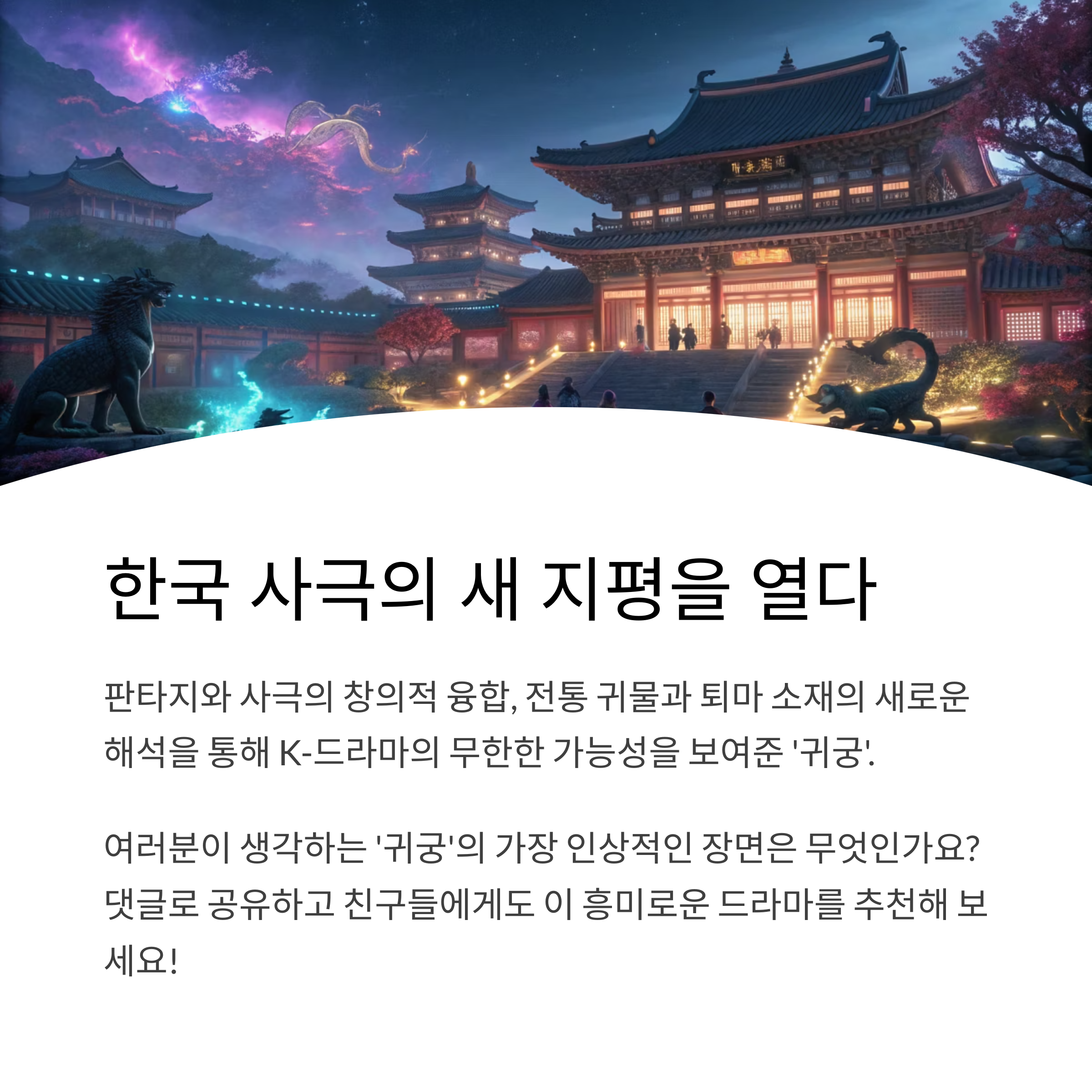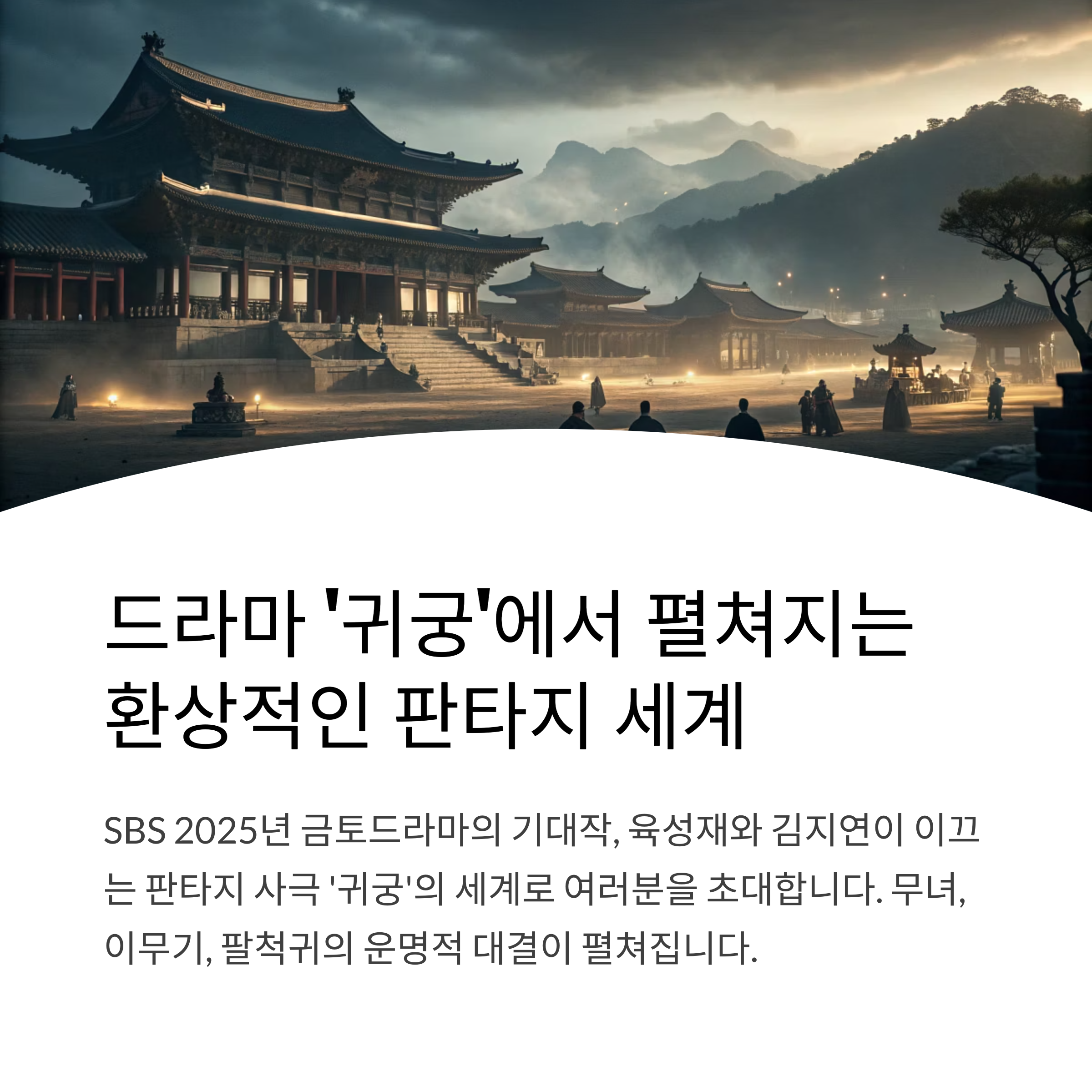 귀궁은 미스터리한 운명을 거부하는 무녀와 이무기, 그리고 조선시대를 배경으로 펼쳐지는 판타지 사극입니다. 여리(김지연)와 윤갑(육성재)의 갈등, 사라진 혼령, 그리고 강력한 존재 팔척귀와의 대결은 시청자들에게 한 번 보면 빠져들 수밖에 없는 서사와 비주얼을 제공합니다.