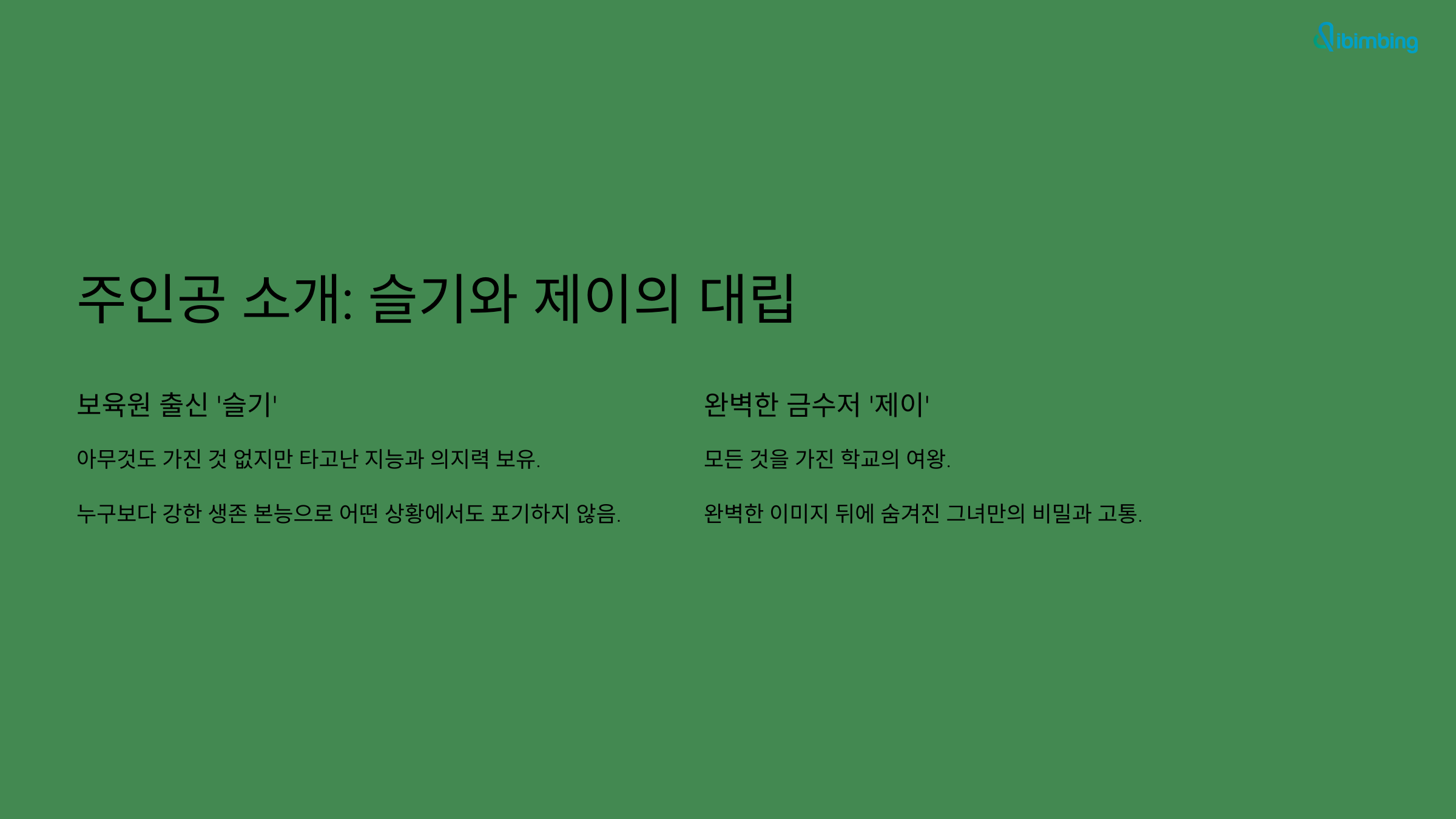 - 주요 인물: 보육원 출신 전학생 '슬기', 완벽한 금수저 유제이의 대립 구도