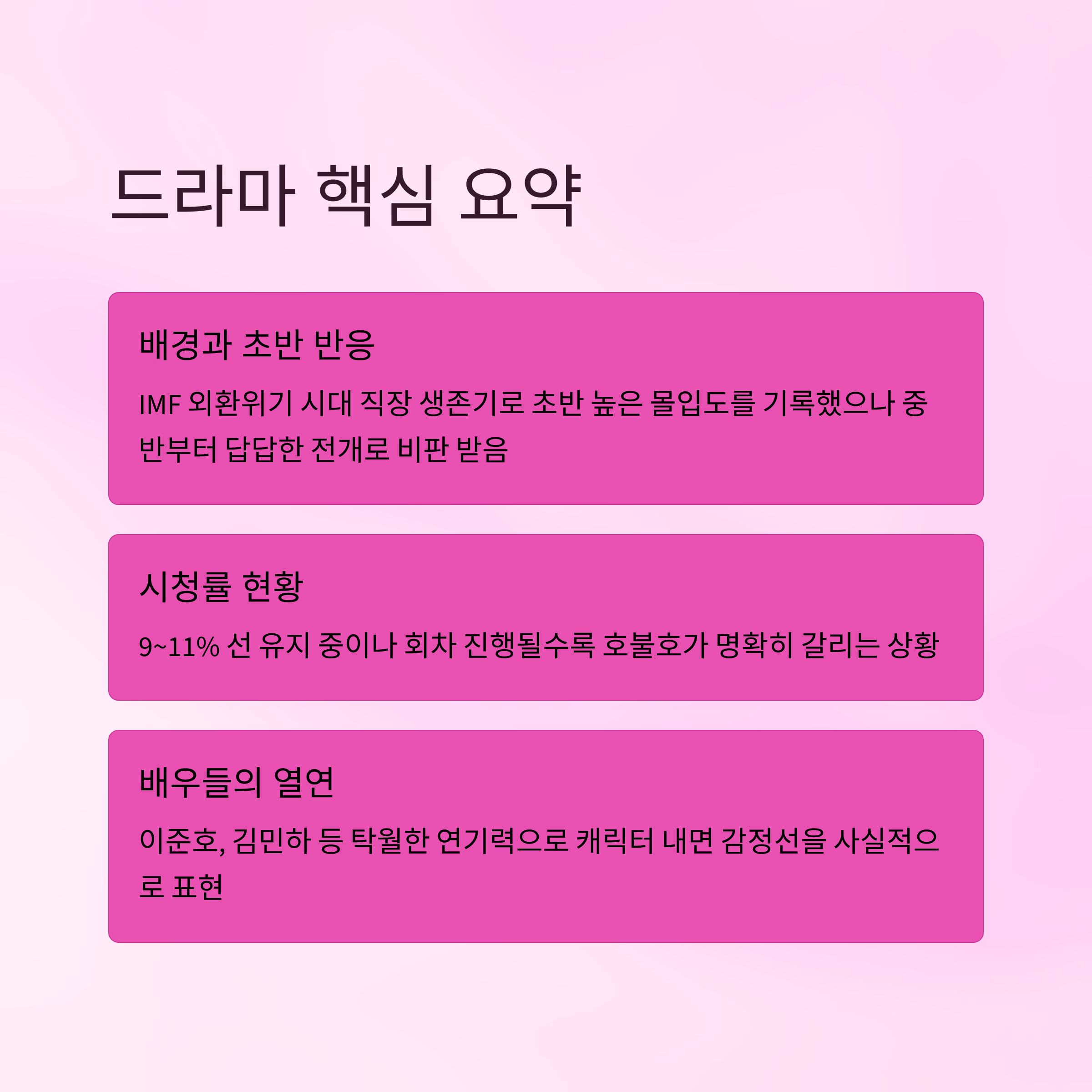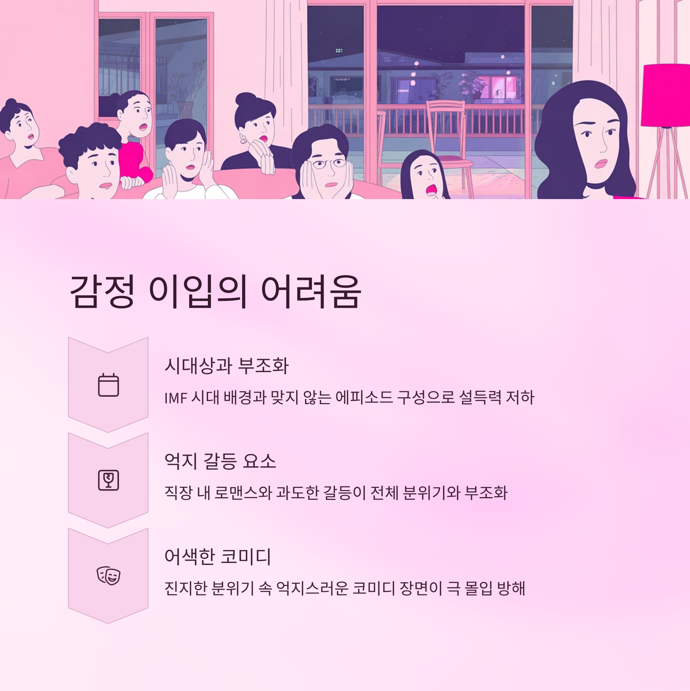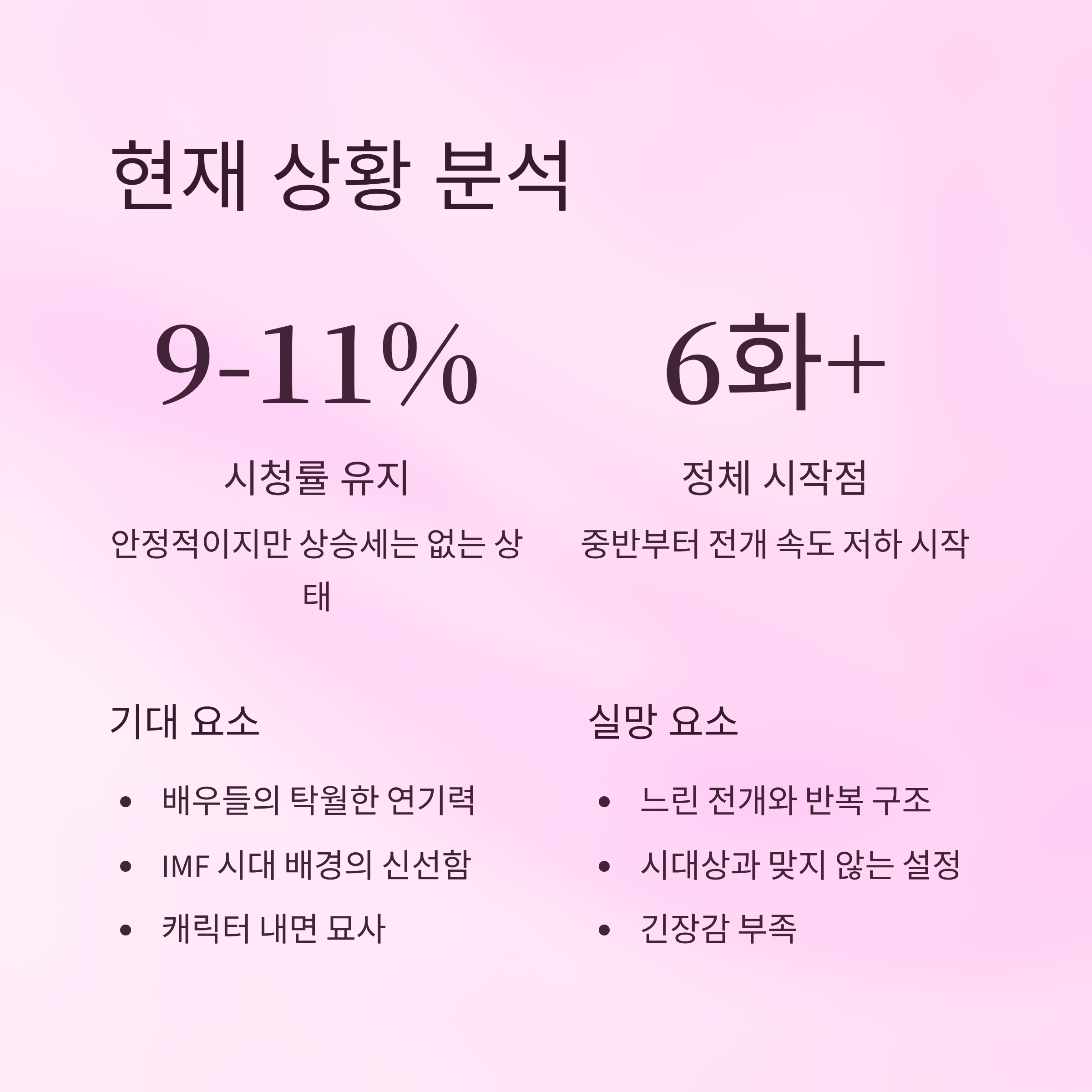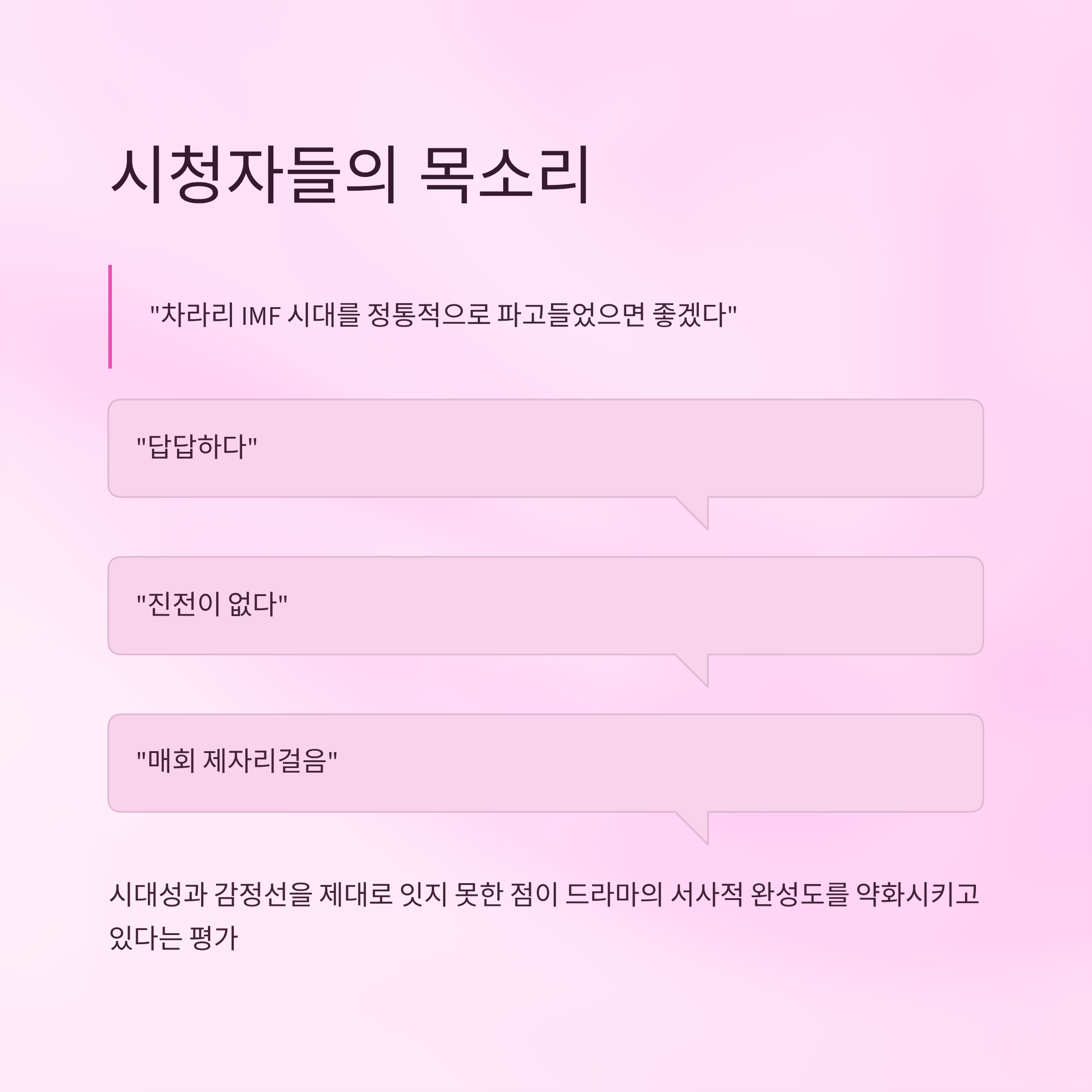 시청자들은 “차라리 IMF 시대를 정통적으로 파고들었으면 좋겠다”는 의견과 함께, 진지한 분위기 속 억지스러운 코미디 장면이 극 몰입을 방해한다고 지적하고 있습니다. 시대성과 감정선을 제대로 잇지 못한 점은 드라마의 서사적 완성도를 깎아먹고 있습니다.