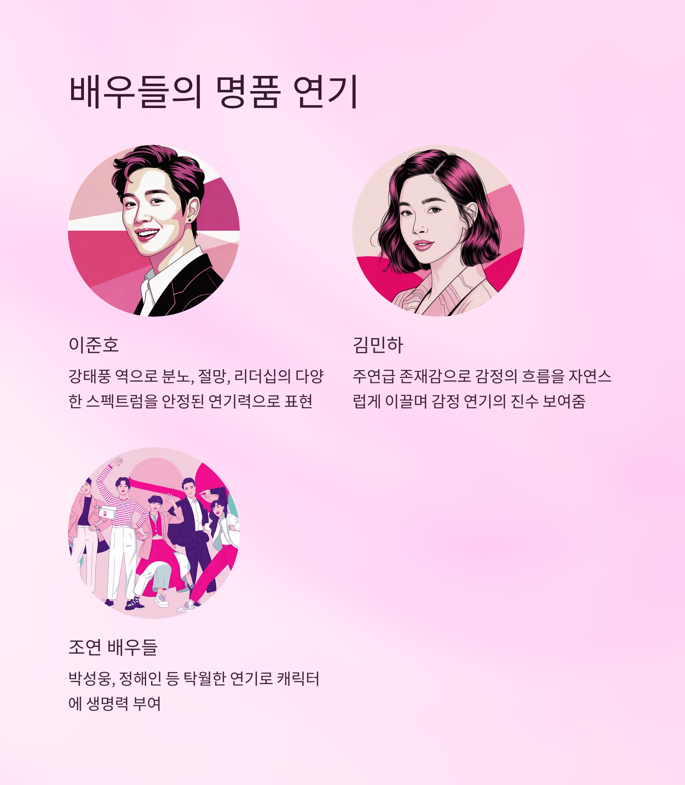 전개와 구성에 대한 아쉬움에도 불구하고, 배우들의 연기는 이 드라마의 유일한 구명줄로 평가받고 있습니다. 이준호는 강태풍이라는 복잡한 인물을 통해 분노, 절망, 리더십의 다양한 스펙트럼을 안정된 연기력으로 표현하며 매회 호평을 받고 있습니다.