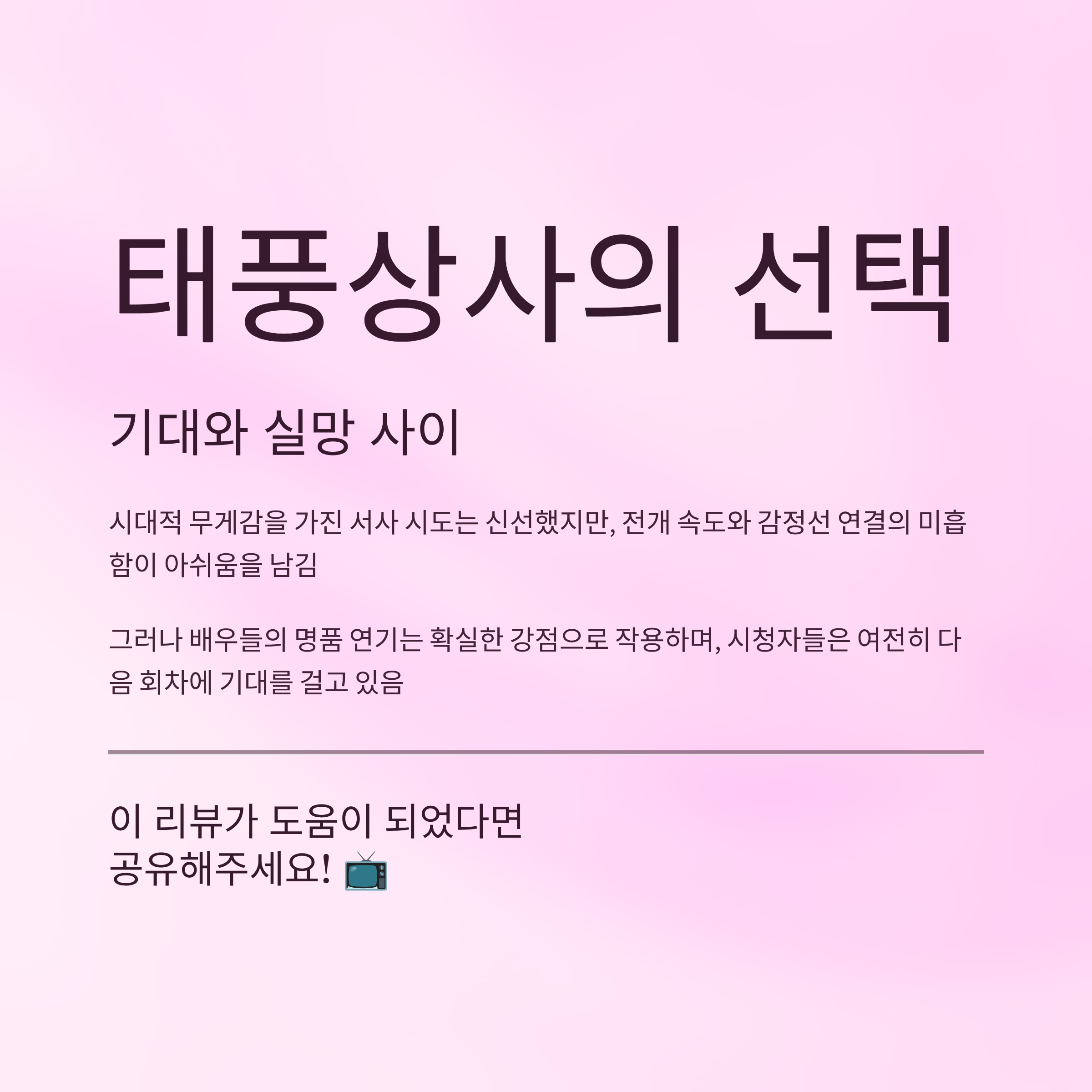 후반부에 들어서며 제작진이 구조적인 전개 개선과 긴장감 회복에 성공한다면, ‘태풍상사’는 다시 한 번 전환점을 맞이할 수 있을 것입니다. 시청자들은 이제 스토리의 전환점과 메시지의 마무리에 주목하고 있으며, 다음 회차에 대한 기대는 여전히 살아 있습니다.