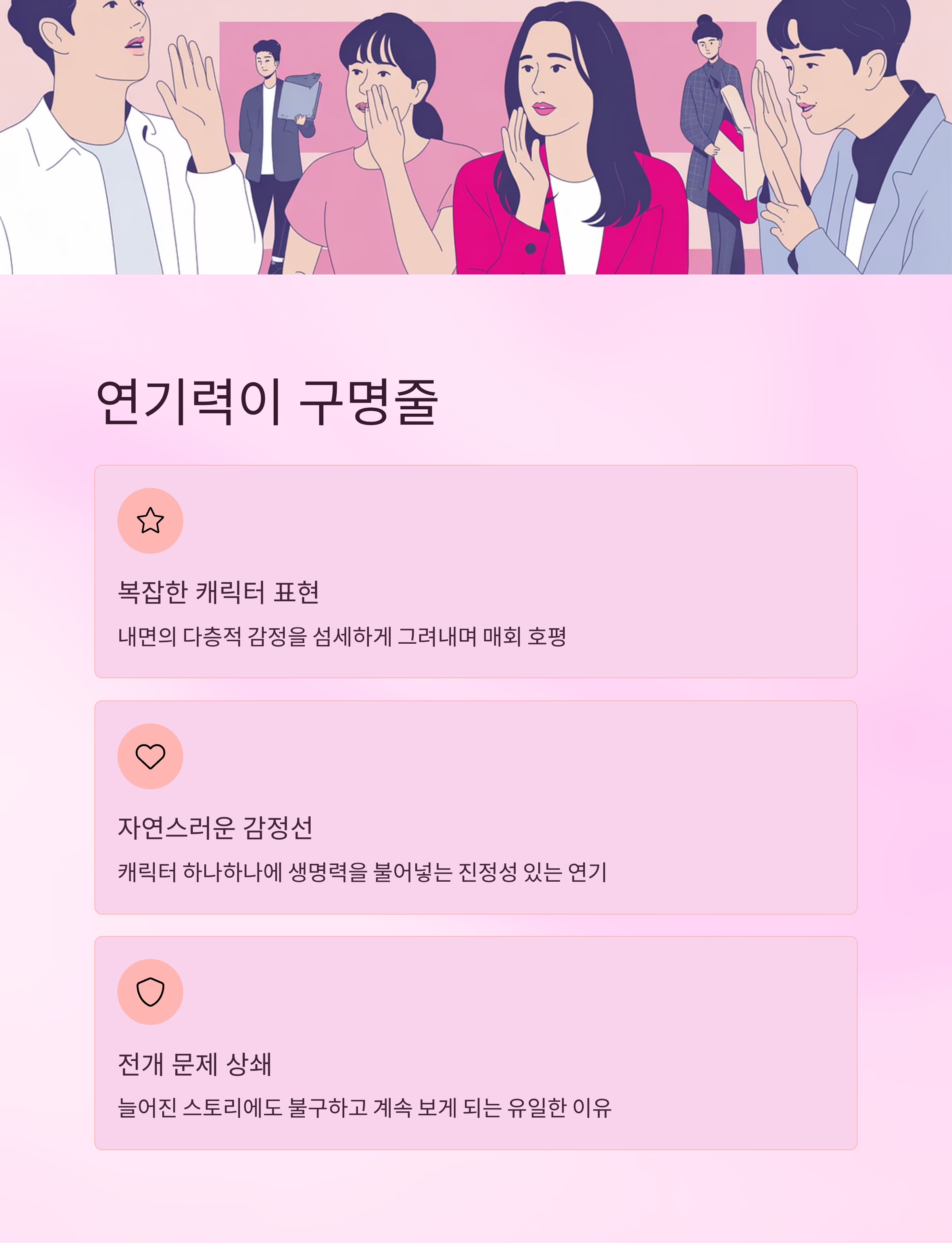 그럼에도 불구하고 배우들의 명품 연기는 확실한 강점입니다. 캐릭터 내면을 세밀하게 표현하고 몰입도를 유지시키는 연기력은, 다소 늘어진 전개에도 불구하고 ‘계속 보게 되는 이유’로 작용합니다.