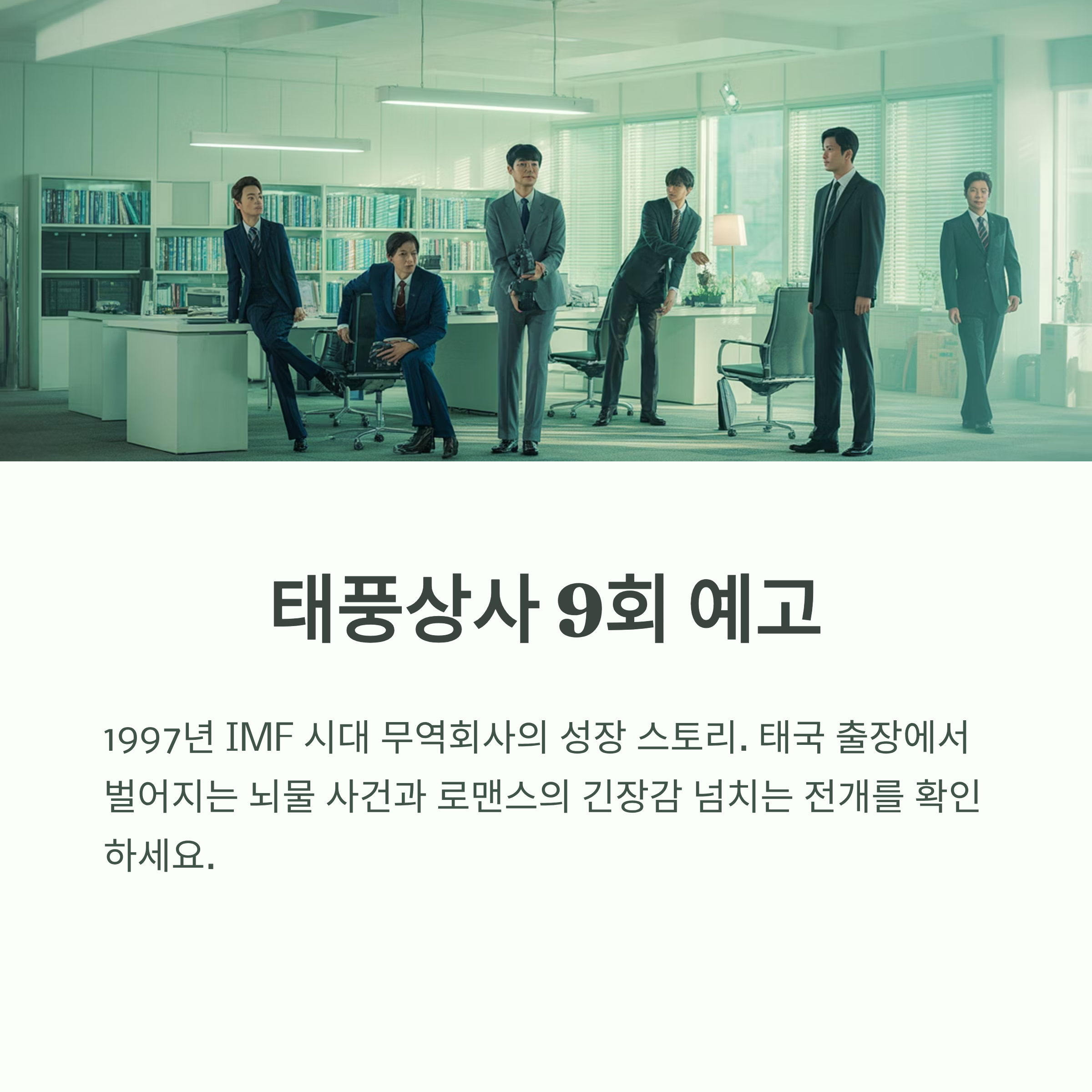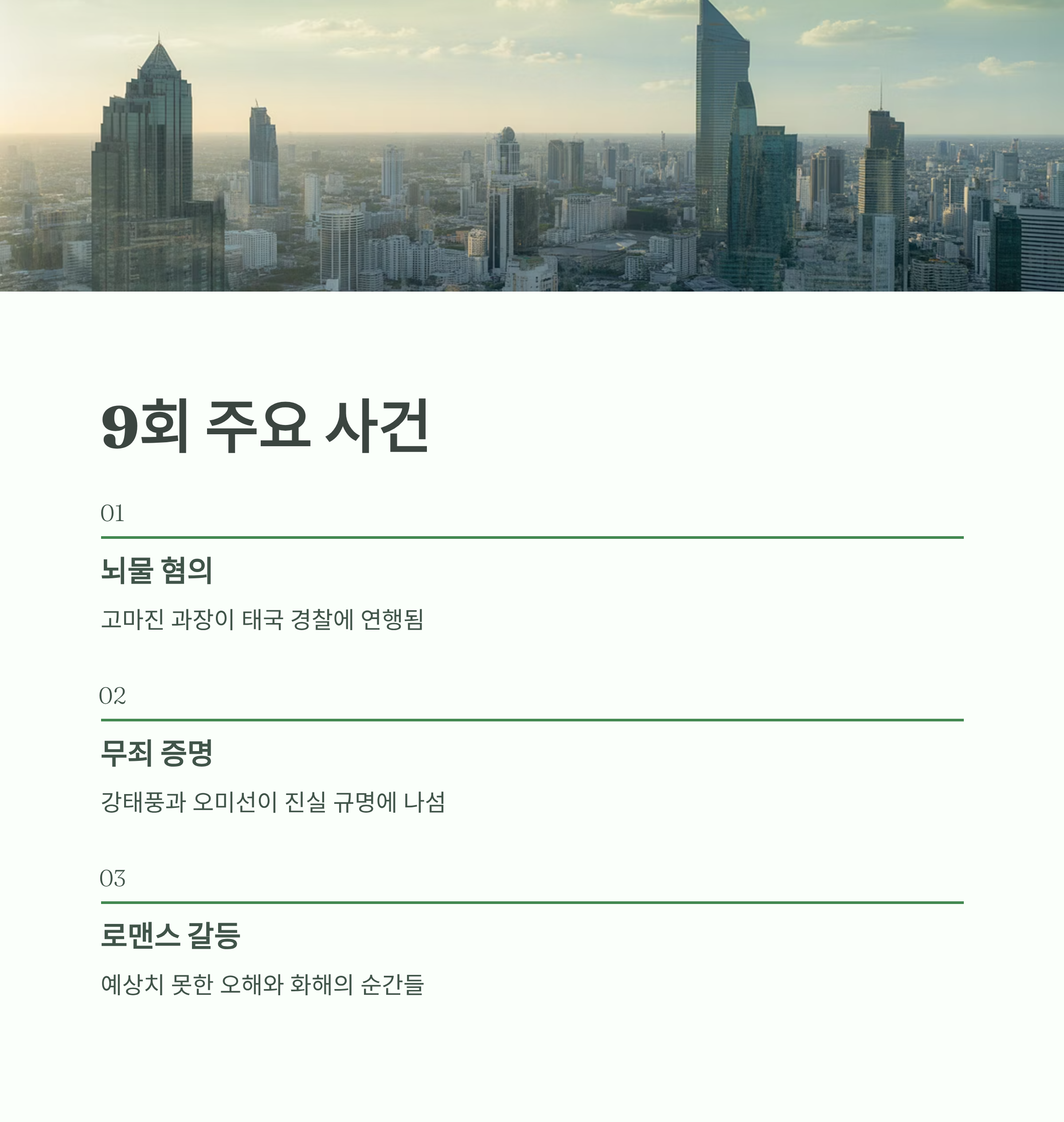 태풍상사 9회는 태국 출장을 통한 사건의 중심이 됩니다. 고마진 과장의 뇌물 사건은 태국 경찰과의 연루로 이어지며, 오미선의 기록 습관이 사건 해결의 단서를 제공합니다. 표현준의 세관 매수로 인해 국제적 비즈니스가 위기에 처합니다. 강태풍과 오미선의 관계 변화가 극적인 전개를 예고하며, 로맨스와 갈등이 중심이 됩니다. 기대를 모으는 나트니차의 등장은 새로운 삼각 관계를 암시합니다.