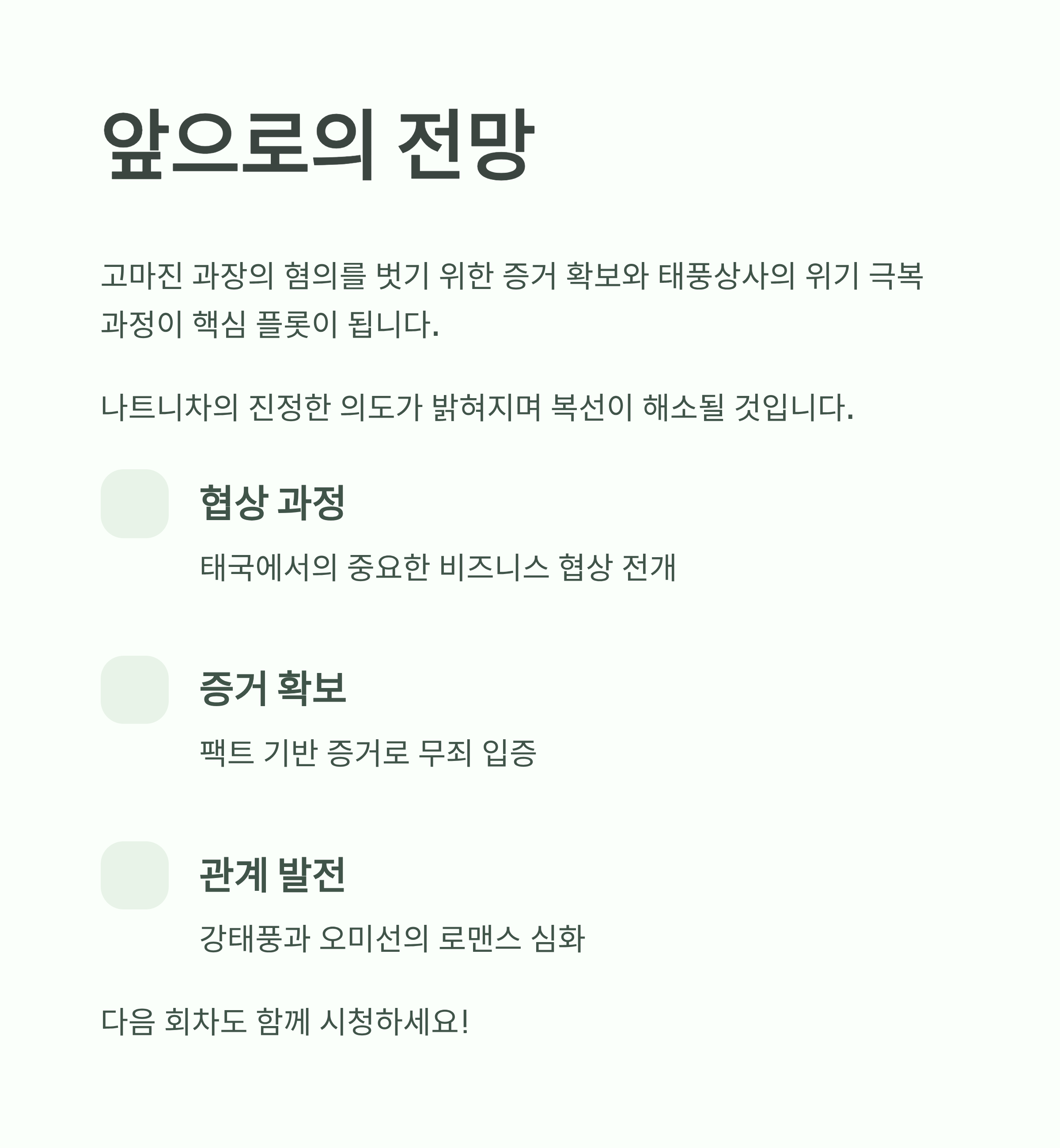 앞으로의 회차에서는 고마진 과장이 혐의를 벗기 위한 팩트 기반 증거와 태풍상사의 위기를 극복하기 위한 주요한 협상 과정이 중심 플롯이 될 것으로 보입니다. 게다가, 나트니차의 의도가 무엇인지에 대한 복선이 회차를 거듭할수록 중요성을 더해갈 것입니다. 이번 에피소드는 글로벌 비즈니스와 사람 간의 갈등이 드라마틱하게 얽히며 이를 풀어가는 서사가 인상적으로 전개될 것으로 예상됩니다.
