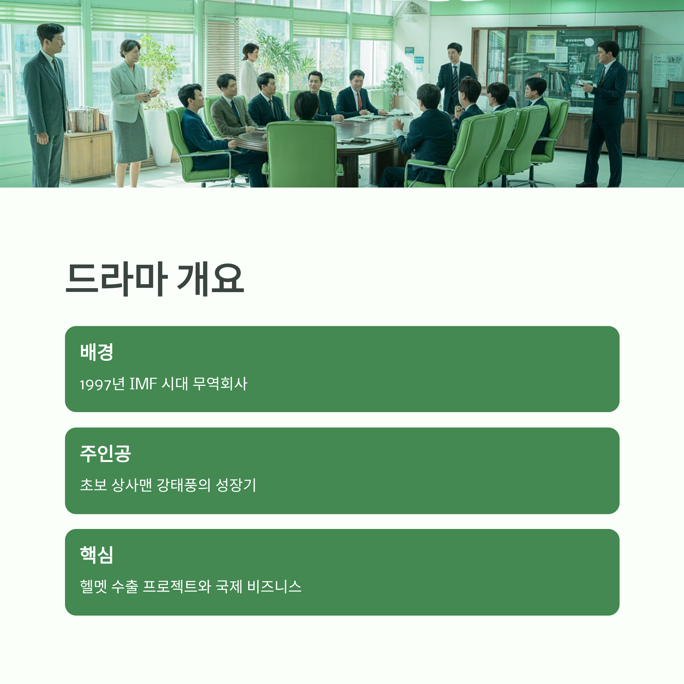 tvN 드라마 '태풍상사'는 1997년 IMF 시대를 배경으로 한 무역 회사 이야기를 다룹니다. 주인공 강태풍은 초보 상사맨으로, 모든 가치를 잃어버린 시대 속에서 회사를 일으키기 위해 고군분투합니다. 이 드라마는 그 속에서 사람 간의 관계, 노력, 그리고 성장 과정을 다채롭게 보여줍니다. 특히 주인공과 동료들이 국제적인 무대를 배경으로 헬멧 수출 프로젝트를 진행하며 벌어지는 사건들을 중심으로 전개됩니다.