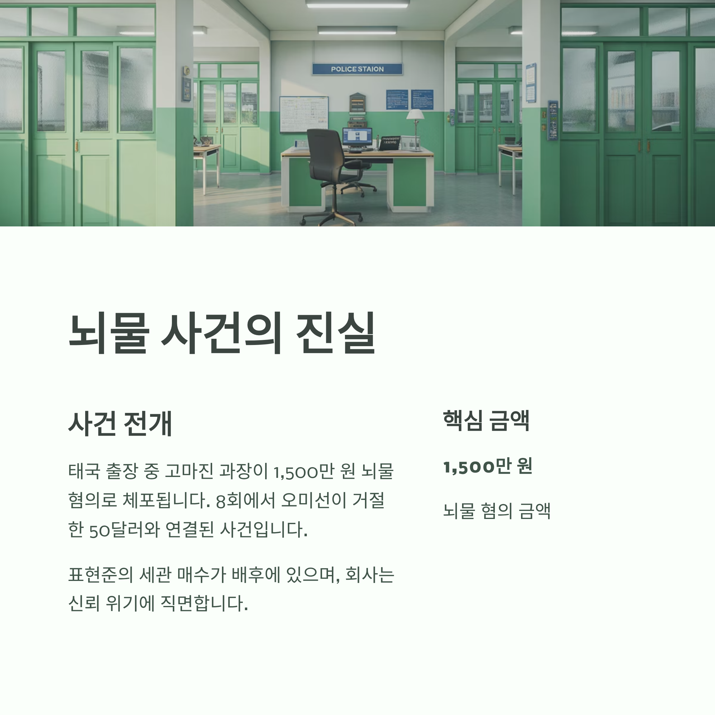 태국 출장의 주요 목적은 헬멧 수출시장 개척이지만, 계획과 달리 고마진 과장이 뇌물 혐의를 받으며 회사는 신뢰 위기를 겪게 됩니다. 뇌물로 의심되는 금액은 약 1,500만 원으로, 이는 8회에서 오미선이 정중히 거절한 50달러와 연결되어 있습니다. 이 사건에서 오미선의 꼼꼼한 기록 습관이 결정적인 역할을 할 것으로 관측됩니다.
