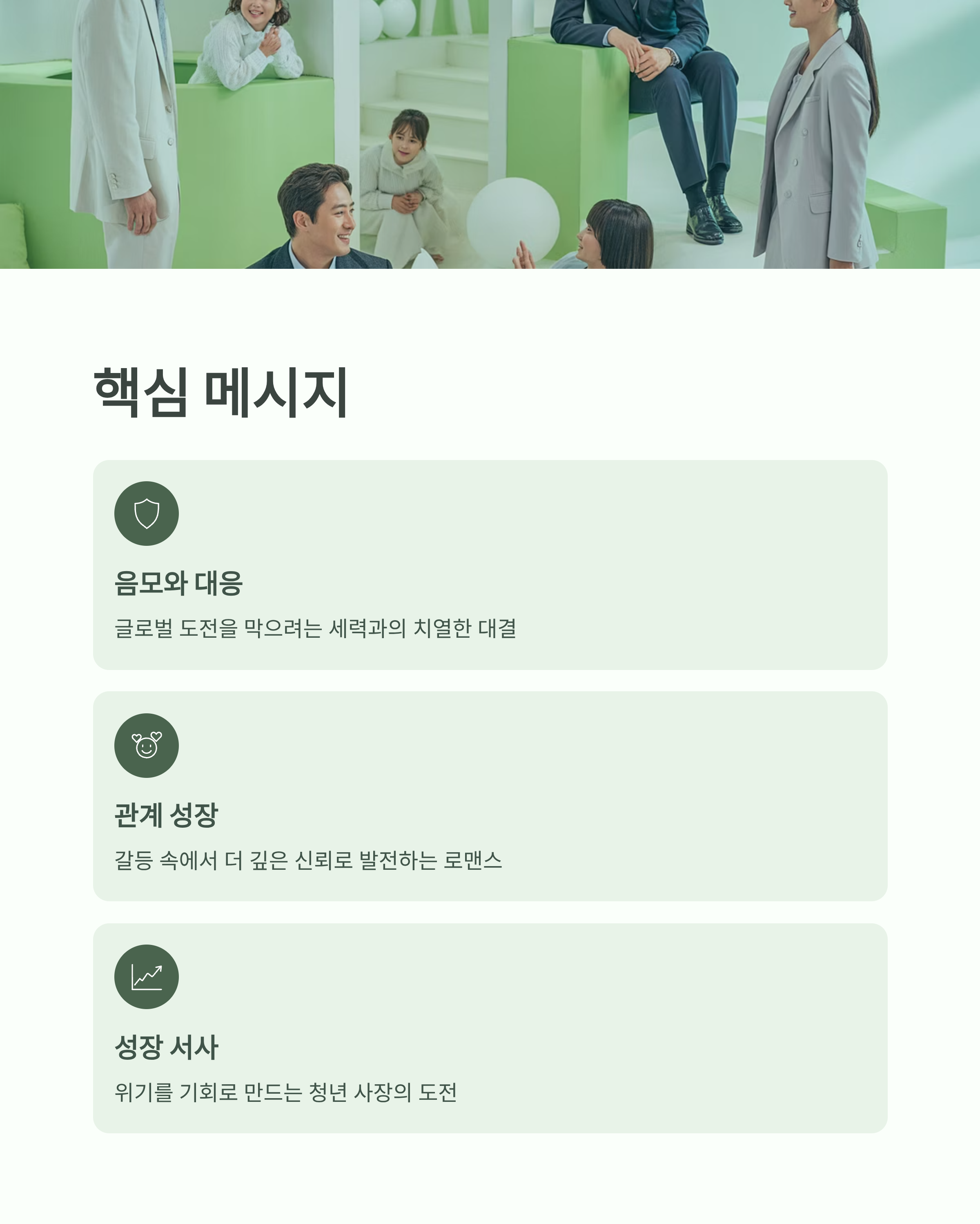 태풍상사 9회는 긴장감 넘치는 플롯과 감정적인 로맨스를 함께 그리며, 명확하게 세 가지 핵심 메시지를 전달합니다. 첫째, 태국 출장과 뇌물 사건은 태풍상사의 글로벌 도전을 막으려는 세력의 음모를 분명히 보여줍니다. 둘째, 강태풍과 오미선의 관계는 갈등과 성장 속에서 더 깊은 신뢰와 사랑으로 변화하게 됩니다. 셋째, 표현준이라는 반대 세력은 스토리를 더욱 다이나믹하게 이끄는 중요한 요소로 드라마의 몰입도를 높이고 있습니다.