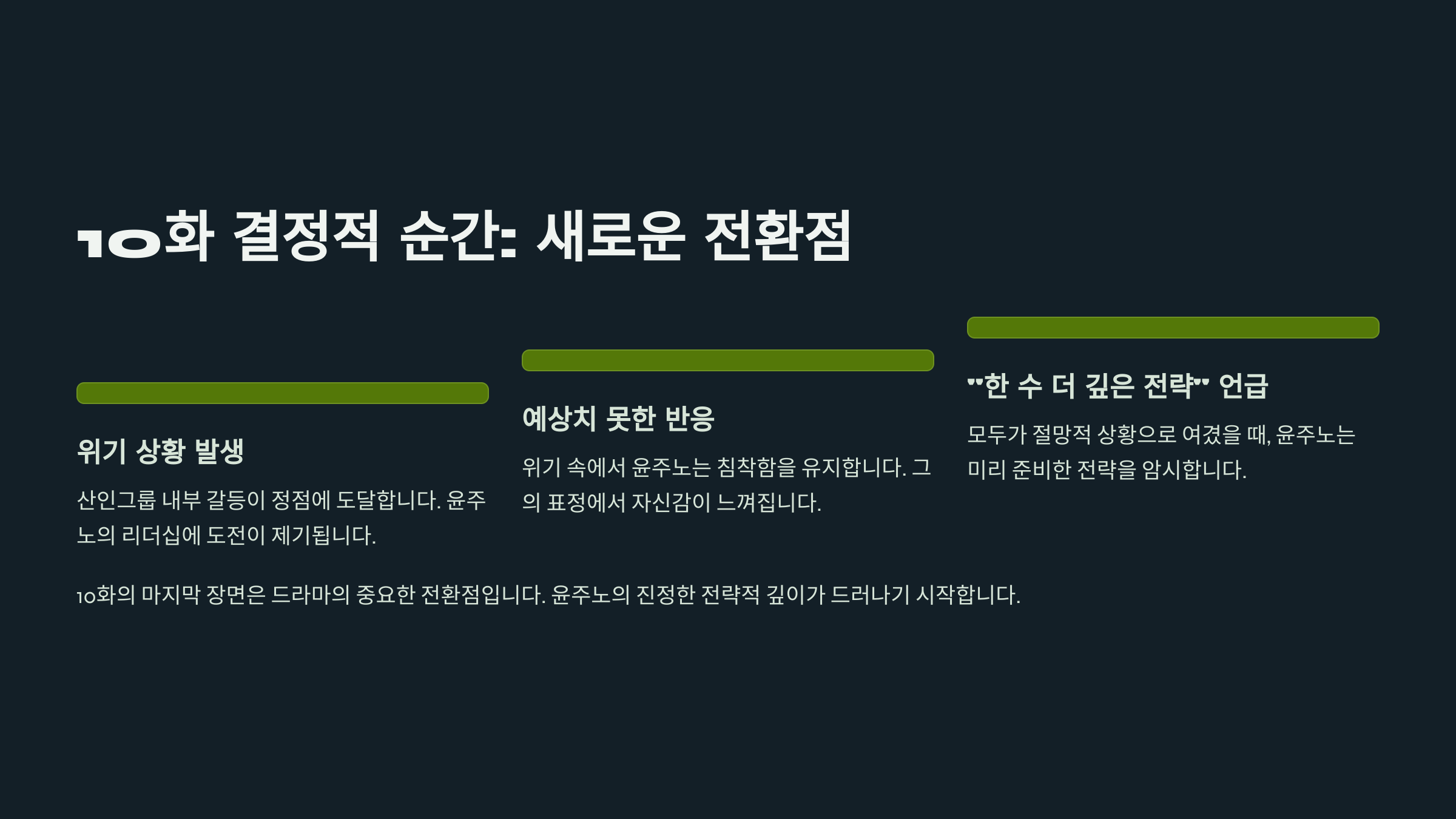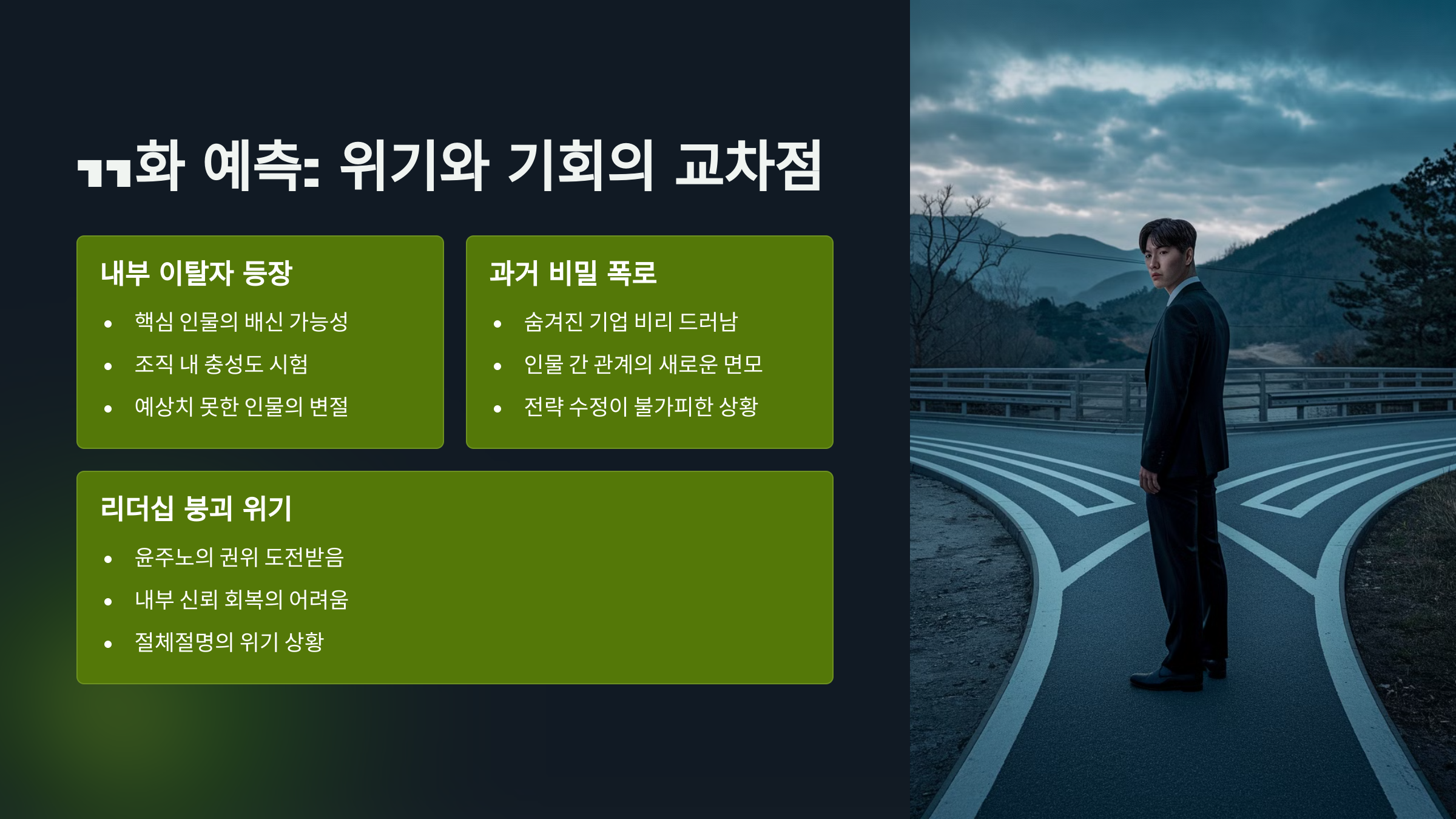 즉, 윤주노의 전략이 성공하더라도 재정적 기반이 무너지는 트리거가 등장할 수 있으며, 이는 내부 신뢰를 송두리째 흔드는 계기로 작용할 수 있습니다. 11화는 이 지점에서 윤주노의 리더십이 ‘도덕적 위기’에 놓이는 국면이 될 수 있습니다.