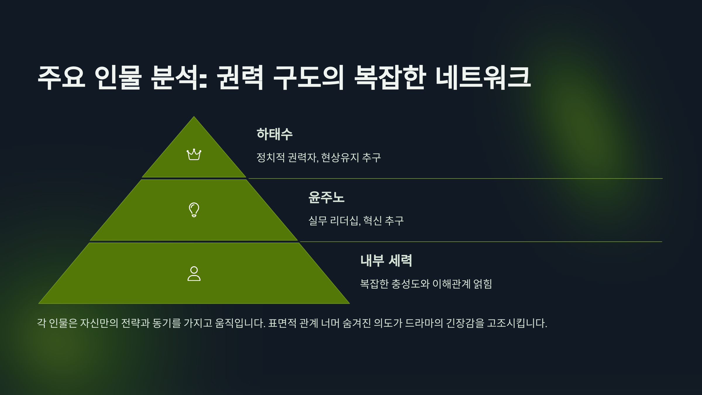 - 하태수와 윤주노의 갈등은 정치권력 대 실무 리더십의 대립 구도를 뚜렷이 한다.