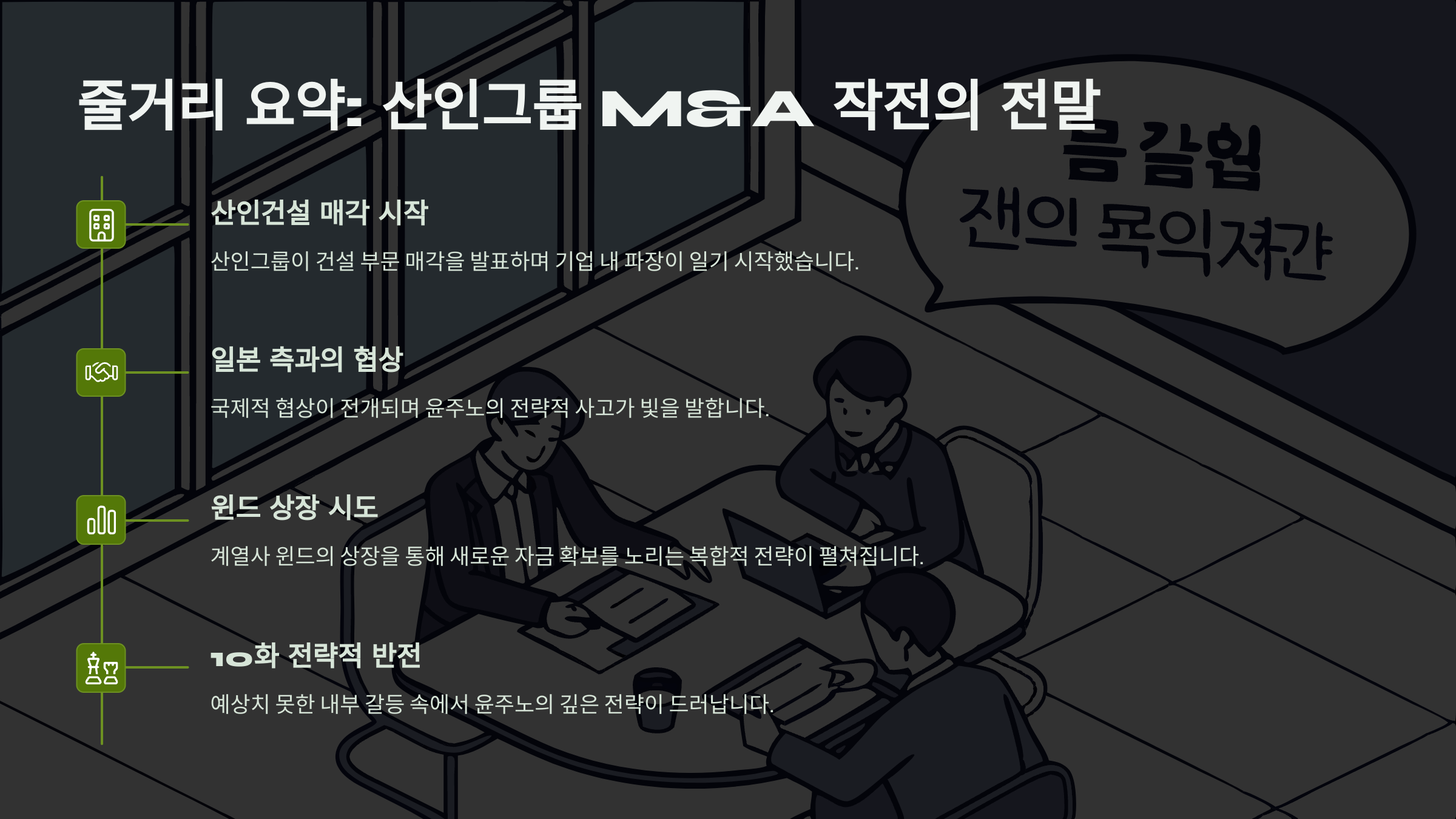 - 산인건설 매각, 일본 협상, 윈드 상장 시도까지 이어진 전개는 협상의 다면성을 보여준다.