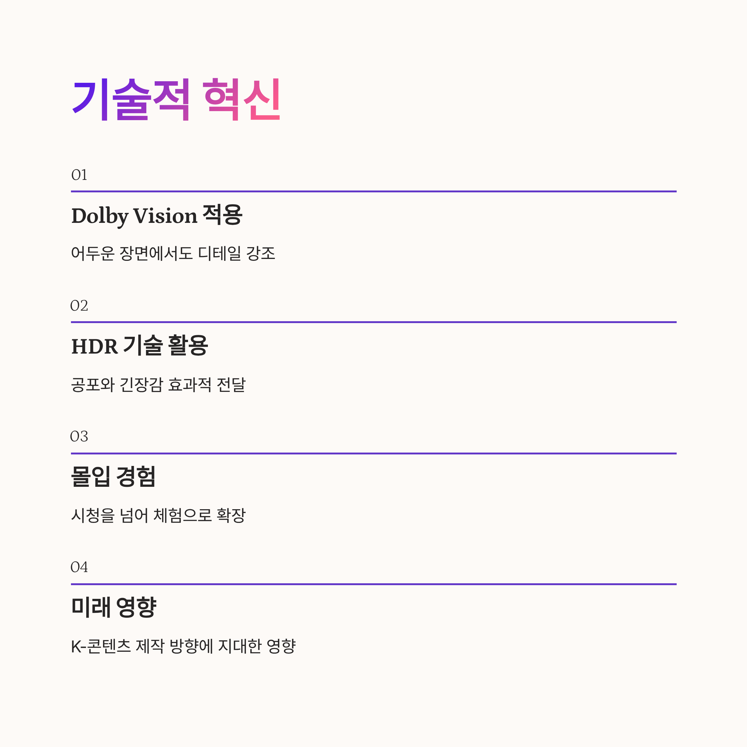 이번 드라마는 첨단 기술력으로도 주목받았습니다. Dolby Vision과 HDR 기술을 통해 어두운 장면에서도 디테일이 강조되며 공포와 긴장감을 효과적으로 전달하였습니다. 이는 단순히 시청을 넘어 ‘체험’으로 확장시키며 드라마 자체에 몰입하는 시청자 경험을 극대화했습니다. 이런 혁신적 기술 활용은 향후 K-콘텐츠 제작 방향에도 지대한 영향을 미칠 가능성이 큽니다.