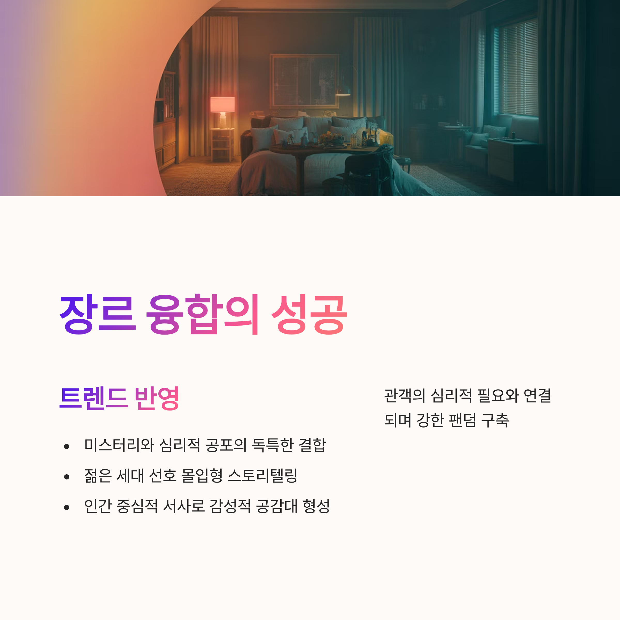 ‘조명가게’는 미스터리와 심리적 공포라는 독특한 장르 융합을 통해 시대적 트렌드와도 어울렸습니다. 특히 젊은 세대가 선호하는 몰입형 스토리텔링과 인간 중심적 서사가 감성적 공감대를 형성하면서 이들의 취향을 공략했습니다. 이러한 트렌드 반영은 단순한 장르 확장이 아니라 관객의 심리적 필요와 연결되며 강한 팬덤을 구축하는 데 기여했습니다.