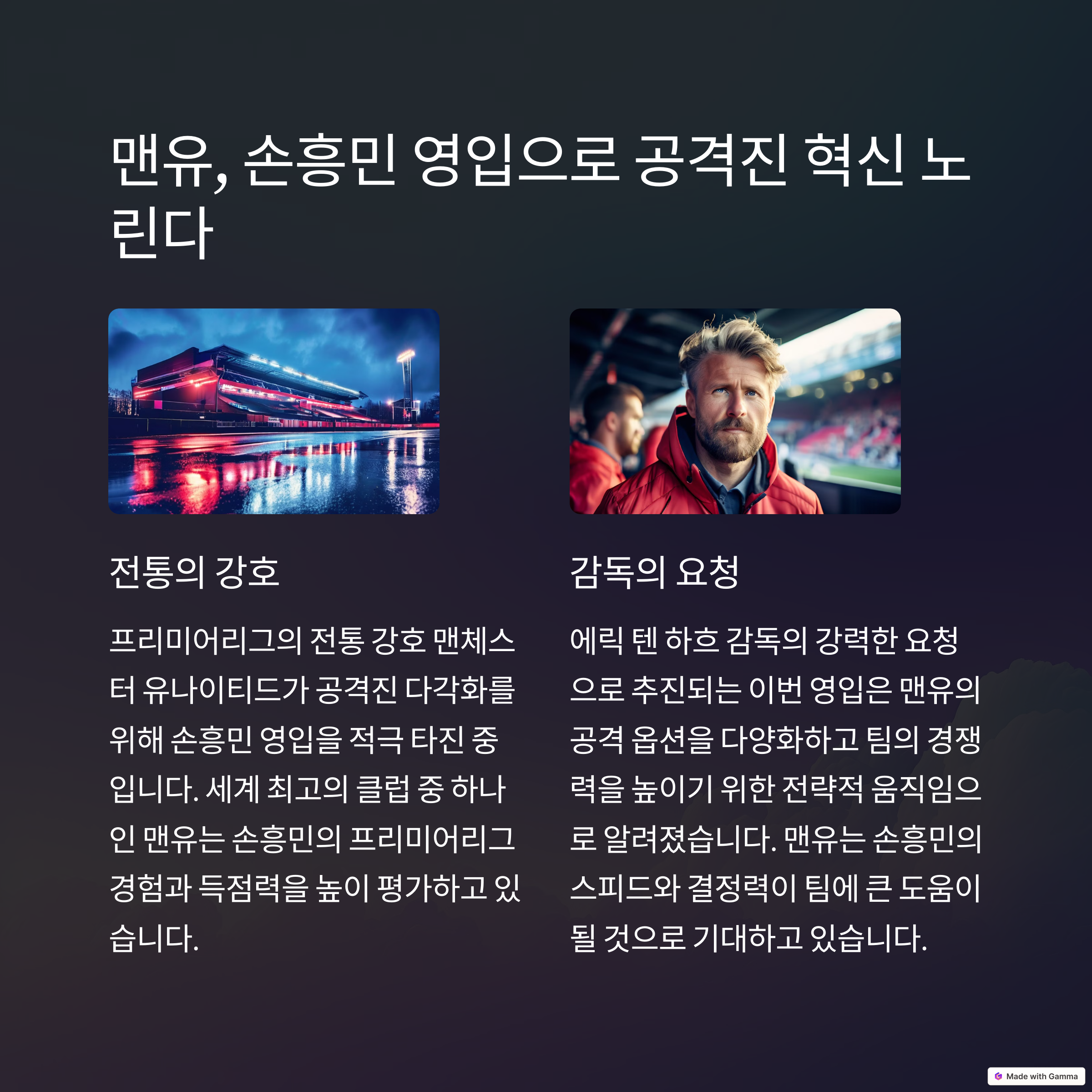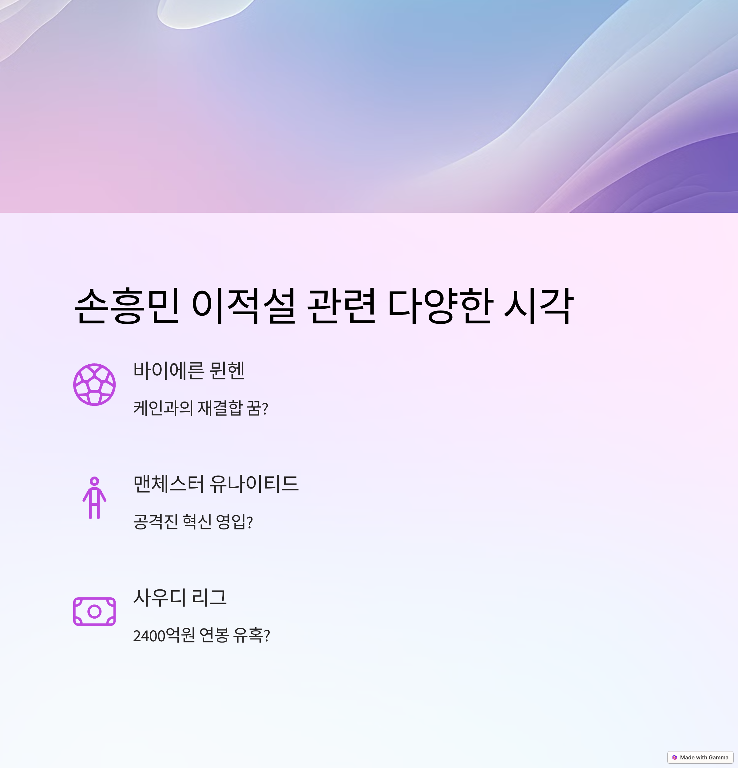 손흥민은 프리미어리그를 대표하는 스타 선수이자 토트넘 홋스퍼의 상징적인 인물입니다. 하지만 그의 이적설은 꾸준히 제기되고 있으며, 2025년 여름 계약 만료를 앞두고 다양한 빅클럽과의 연결이 잇따르고 있습니다. 특히 최근에는 독일의 명문 바이에른 뮌헨, 잉글랜드 맨체스터 유나이티드, 그리고 사우디아라비아 클럽들이 손흥민 영입에 강한 관심을 보이고 있다는 보도가 나오면서 팬들의 궁금증이 커지고 있습니다. 이번 글에서는 영국 및 유럽 언론이 주목하고 있는 손흥민 이적설에 대해 집중 분석하고, 그의 향후 거취가 어떻게 전개될 가능성이 있는지 심도 있게 다뤄보겠습니다.