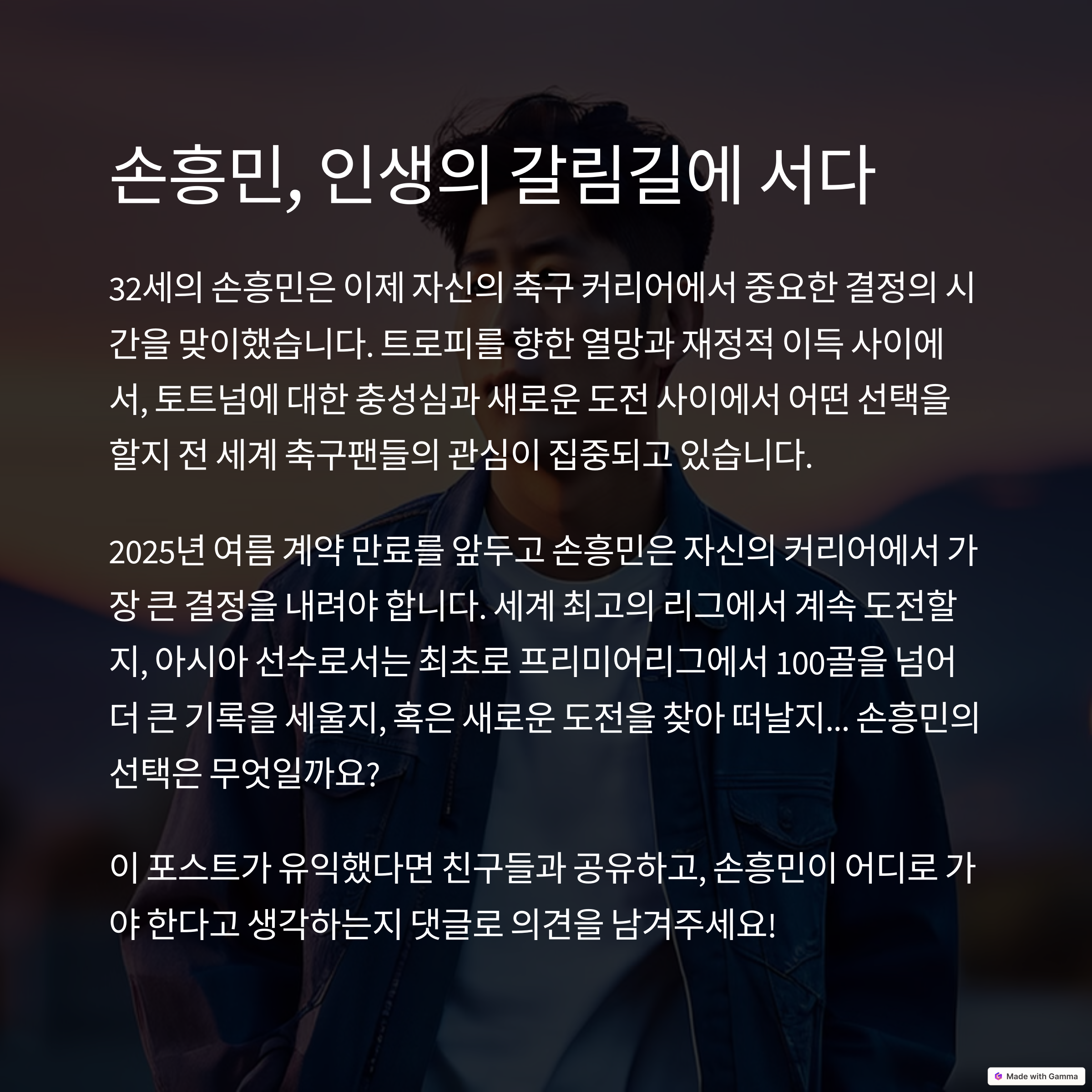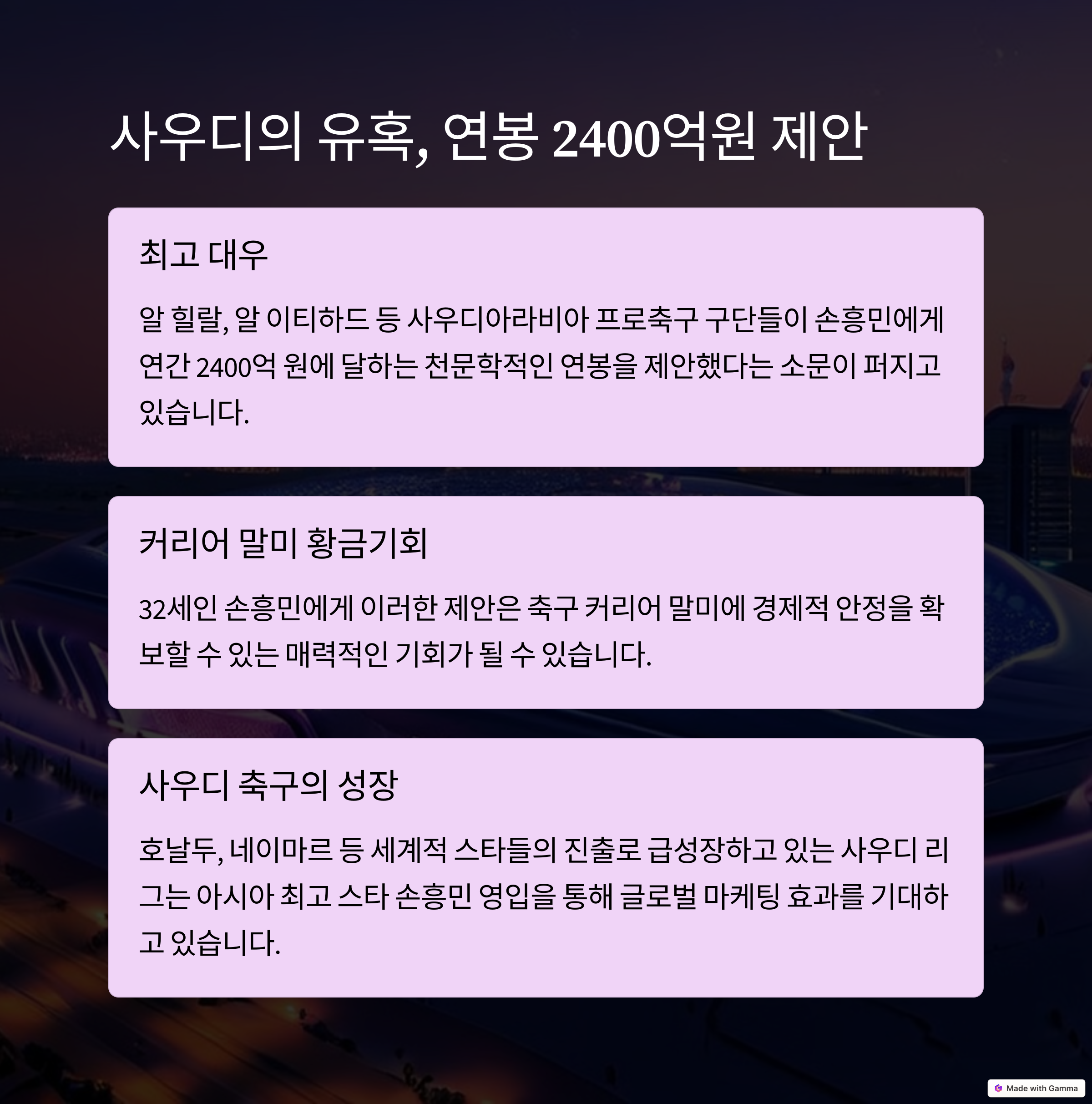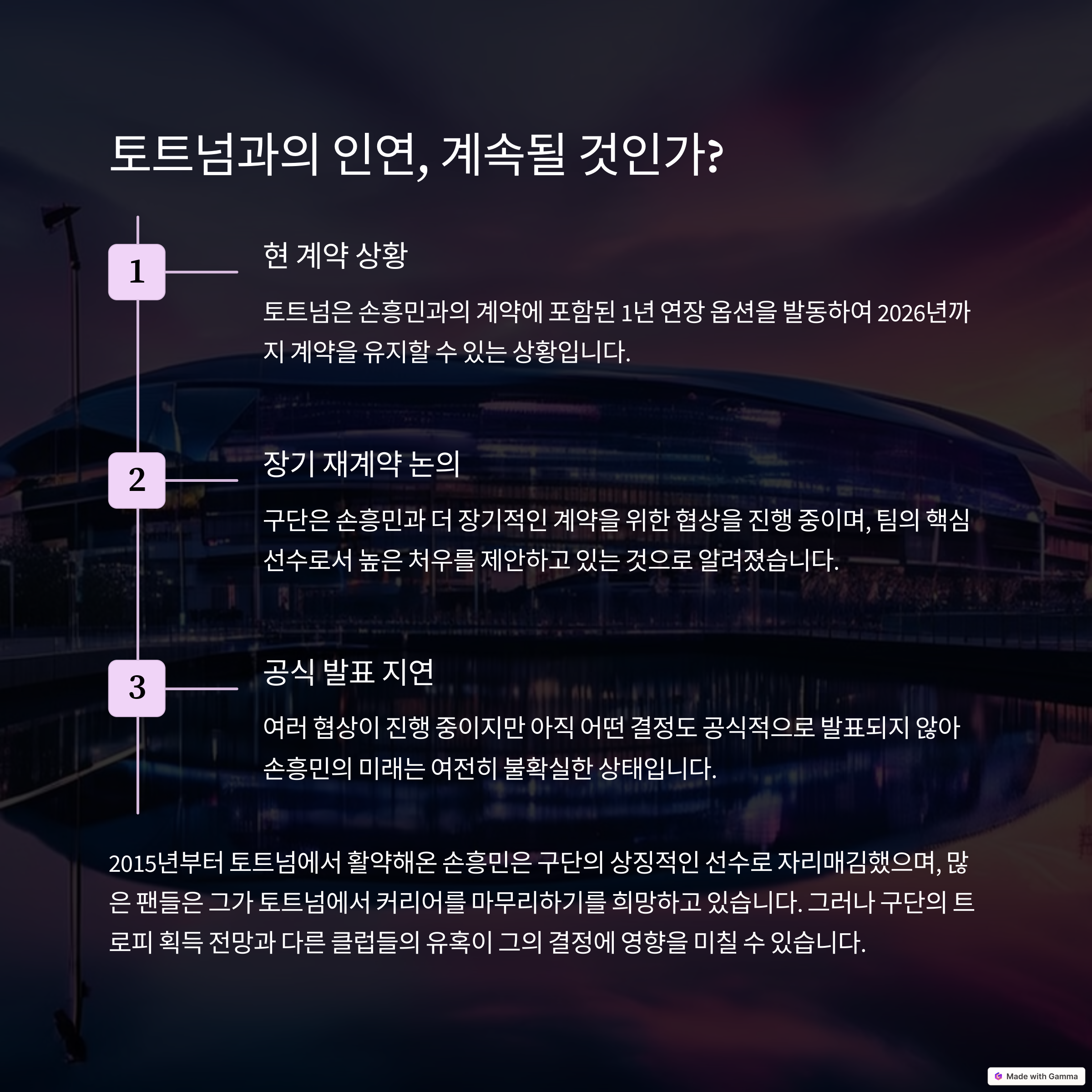 손흥민의 이적설은 이번 시즌을 기점으로 더욱 구체화될 가능성이 있습니다. 토트넘과 재계약 협상이 교착 상태에 빠지거나 팀 성적이 부진할 경우, 손흥민은 커리어의 마지막을 고려해 이적을 택할 수도 있습니다. 바이에른 뮌헨과 맨체스터 유나이티드는 유럽 무대에서 경쟁력을 유지할 수 있는 클럽이며, 사우디아라비아 리그는 경제적 메리트를 제공합니다. 결국 손흥민의 선택은 커리어의 가치와 명예, 그리고 경제적 이득 사이에서 결정될 것으로 보입니다. 팬들은 그의 선택을 존중하고, 앞으로의 활약을 응원할 것입니다.