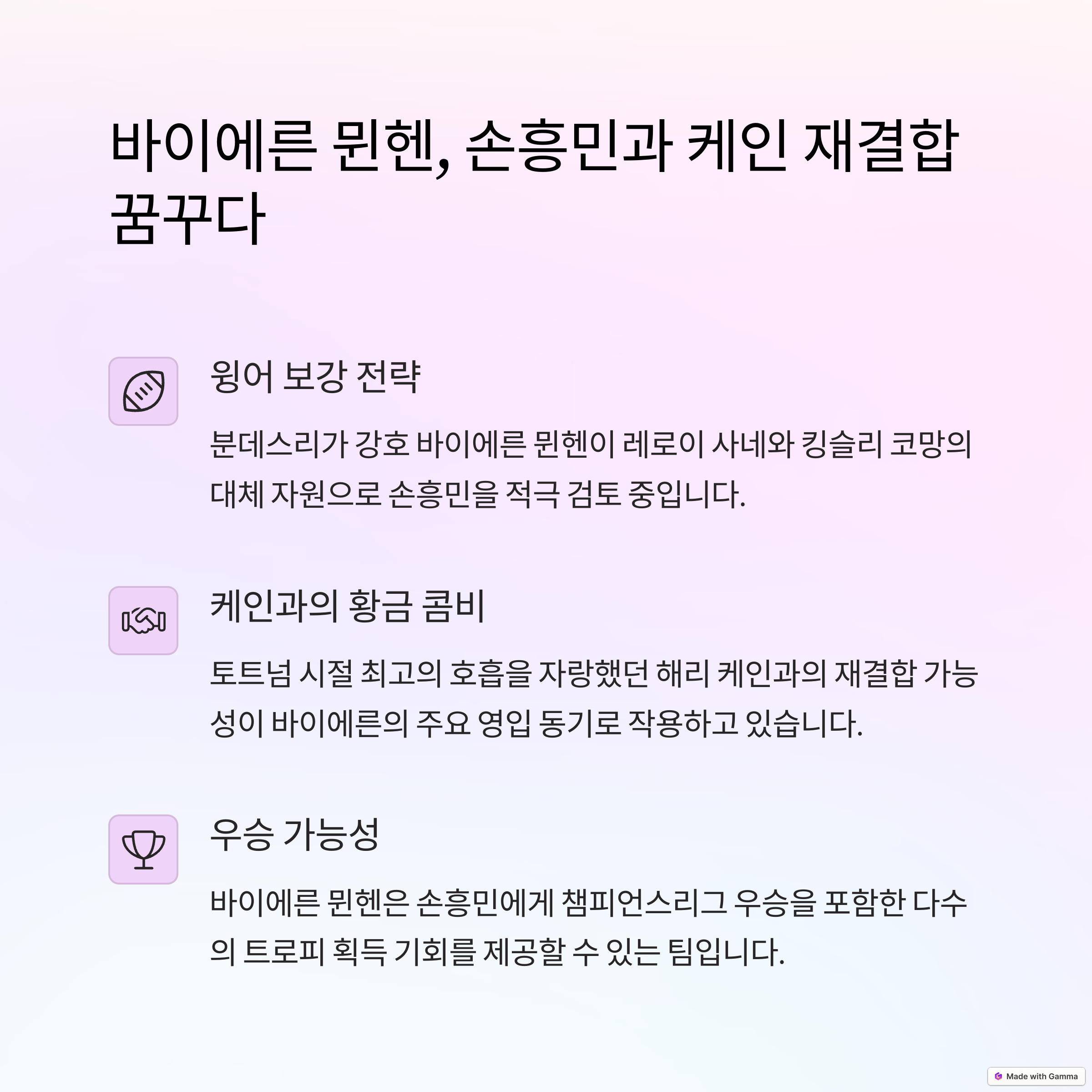 A1. 바이에른 뮌헨은 윙어 자원 보강이 필요하고, 손흥민은 분데스리가 경험과 검증된 능력을 갖췄기 때문입니다.