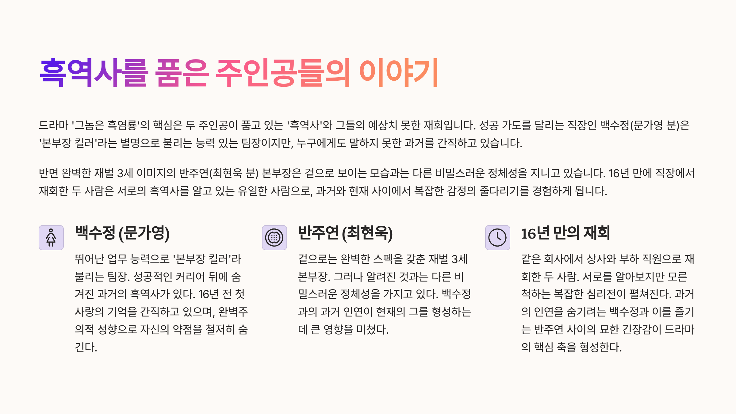 ‘첫사랑이 흑역사였다면?’ 이 드라마의 핵심은 바로 여기에 있습니다. 백수정과 반주연은 어린 시절 온라인 게임에서 첫사랑으로 만나지만, 그 기억은 서로에게 상처로 남습니다. 성인이 된 후 직장에서 재회한 두 사람은 과거 '흑염룡'의 존재를 다시 마주하게 되고, 백수정은 반주연이 바로 그 흑염룡이었다는 사실에 충격을 받습니다. 하지만 시간이 흐를수록 그에 대한 감정은 혼란에서 이해와 애정으로 발전합니다. 두 사람은 흑역사와 감정을 솔직하게 마주하며 서로를 치유하고, 과거를 극복하는 과정을 통해 깊은 사랑으로 나아갑니다. 이러한 감정선은 많은 시청자에게 공감을 주며, 드라마의 몰입도를 높이는 핵심 요소가 됩니다.