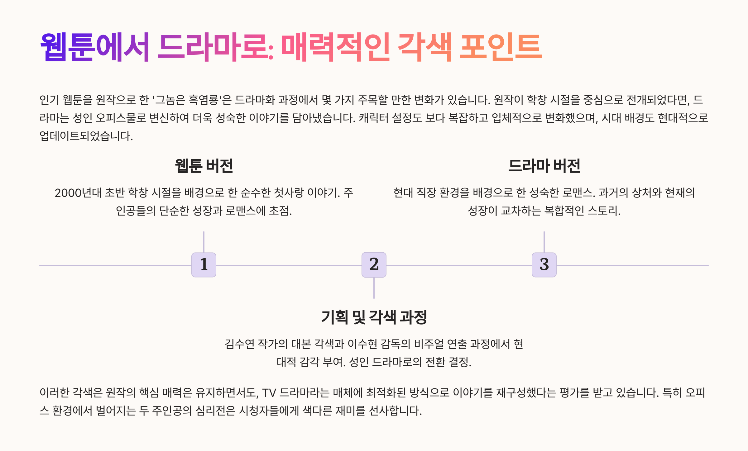 A1. 첫사랑과 흑역사를 중심으로 한 감정선과, 덕후 본부장과 냉철한 팀장의 반전 케미가 주요 매력 포인트입니다.