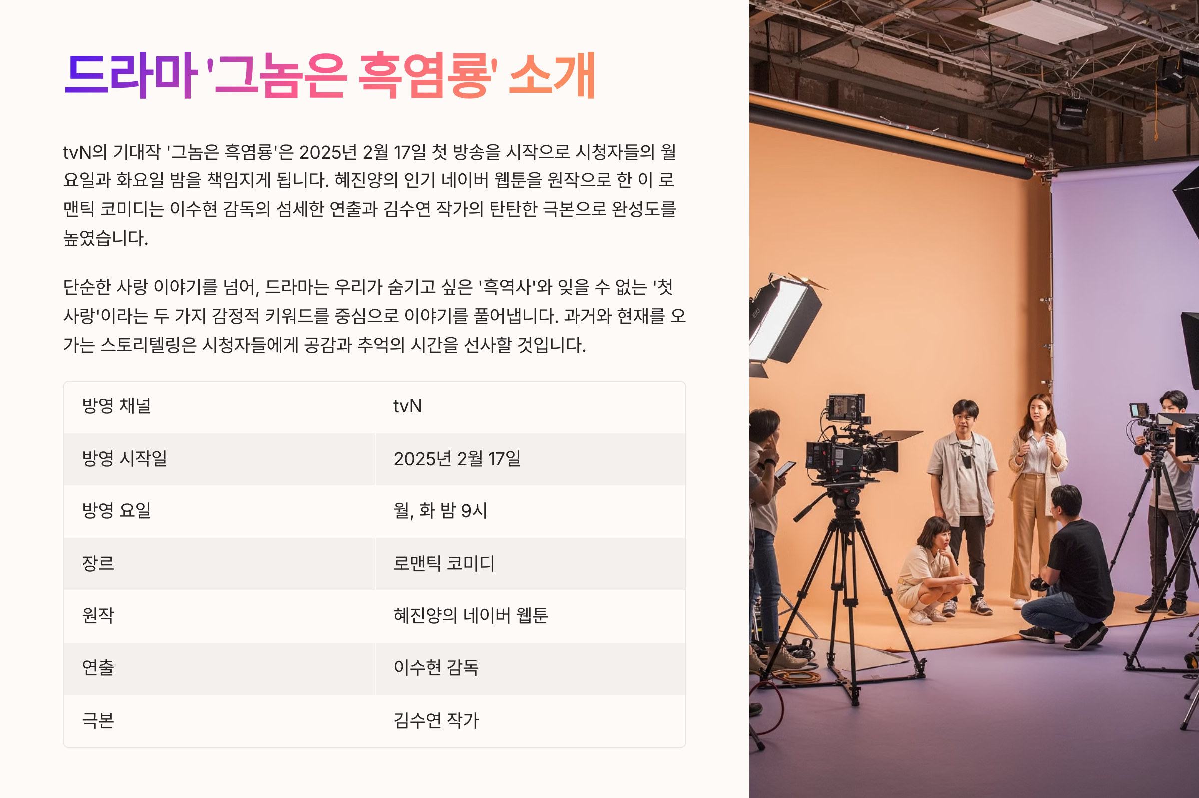 “첫사랑은 흑역사?”라는 다소 충격적인 질문으로 시작하는 이 드라마, 바로 tvN의 ‘그놈은 흑염룡’입니다. 2025년 2월 17일부터 방영된 이 로맨틱 코미디는 단순한 사랑 이야기를 넘어, 누구나 한 번쯤 숨기고 싶은 과거와 마주하게 되는 두 주인공의 성장기를 그립니다. 원작 웹툰의 인기를 바탕으로 제작된 이 드라마는, 연출 이수현 감독과 극본 김수연 작가의 손을 거쳐 더욱 완성도 높은 스토리로 재탄생했습니다. 문가영과 최현욱의 연상연하 케미는 첫 방송부터 화제를 모았고, 과거와 현재를 넘나드는 복잡한 감정선은 시청자들의 몰입도를 높였습니다. 과연, 흑역사와 첫사랑이 얽힌 이들의 이야기가 어떻게 전개될지, 그 흥미로운 반전 로맨스를 집중 분석해 보겠습니다.