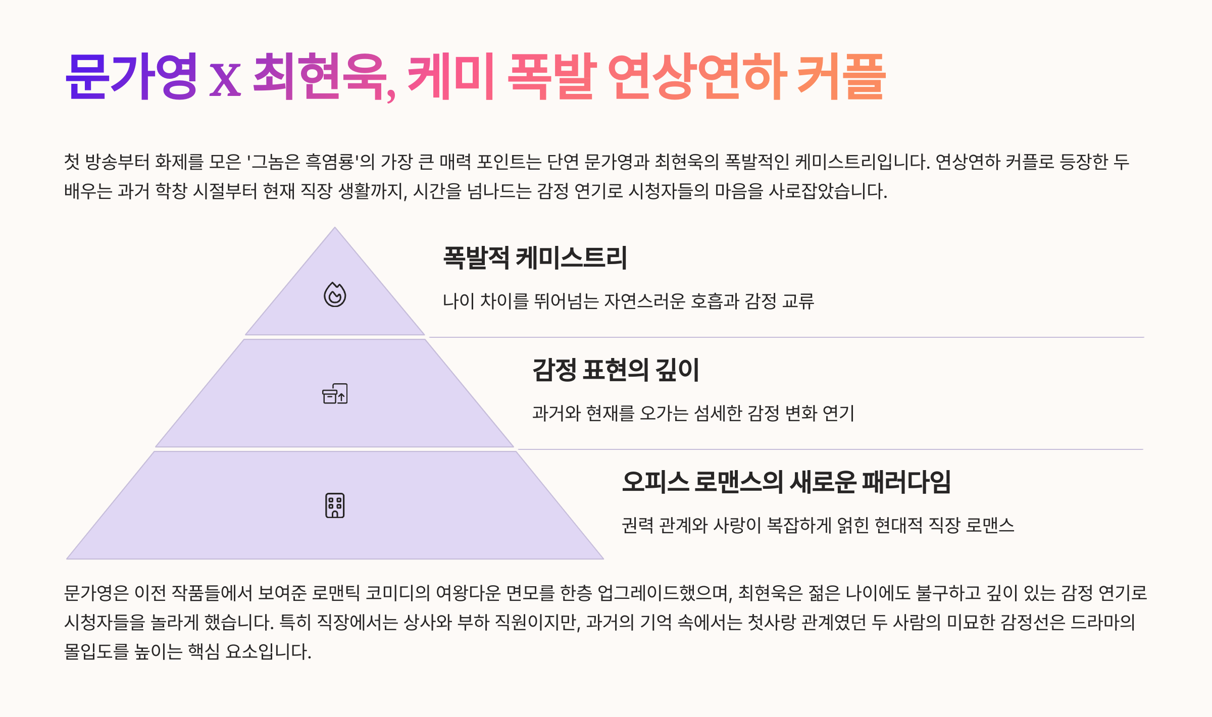 ‘그놈은 흑염룡’은 16년 전 온라인 게임에서 만난 첫사랑과 재회한 두 남녀의 이야기를 중심으로 전개됩니다. 백수정(문가영)은 용성백화점 기획팀 팀장으로 성공한 커리어 우먼이지만, 과거 첫사랑과의 상처를 안고 있습니다. 반주연(최현욱)은 재벌 3세이자 본부장으로, 외적으로는 완벽하지만 내면에는 흑역사 덕후 자아 '흑염룡'을 숨기고 있습니다. 두 사람은 직장에서 다시 만나면서 서로의 감정을 다시 확인하고, 과거의 아픔을 극복하며 사랑을 찾아가는 과정을 그립니다. 시청률은 꾸준히 상승해 최고 5.1%를 기록했고, 글로벌 OTT 플랫폼에서도 1위를 차지하며 국제적인 인기를 누리고 있습니다.