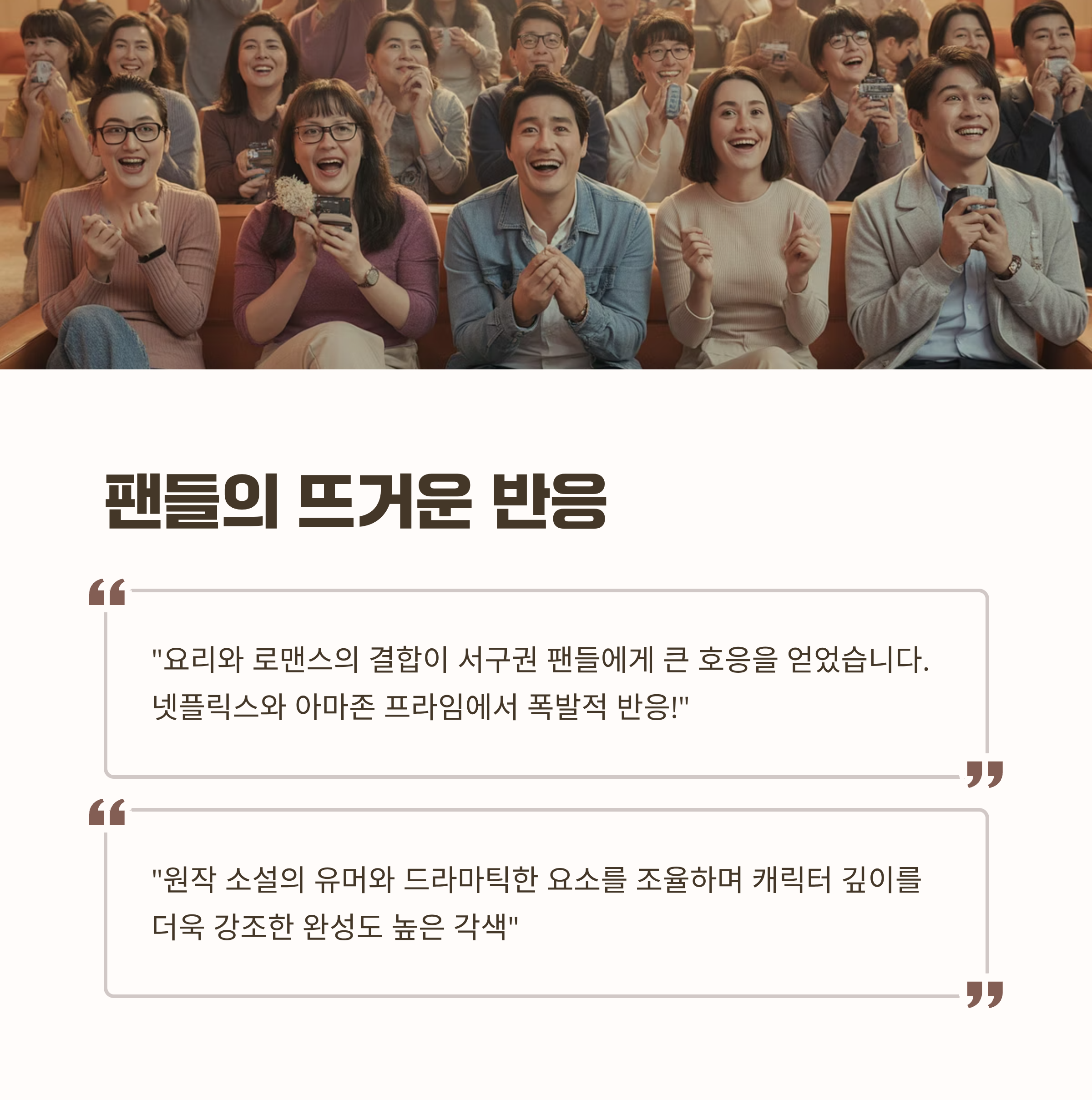| A. 넷플릭스와 아마존 프라임 등 글로벌 플랫폼에서 비영어권 드라마 1위를 차지하는 등 폭발적인 반응을 얻었습니다. 특히 요리와 로맨스를 결합한 내용이 서구권 팬들에게 큰 호응을 얻었습니다. |