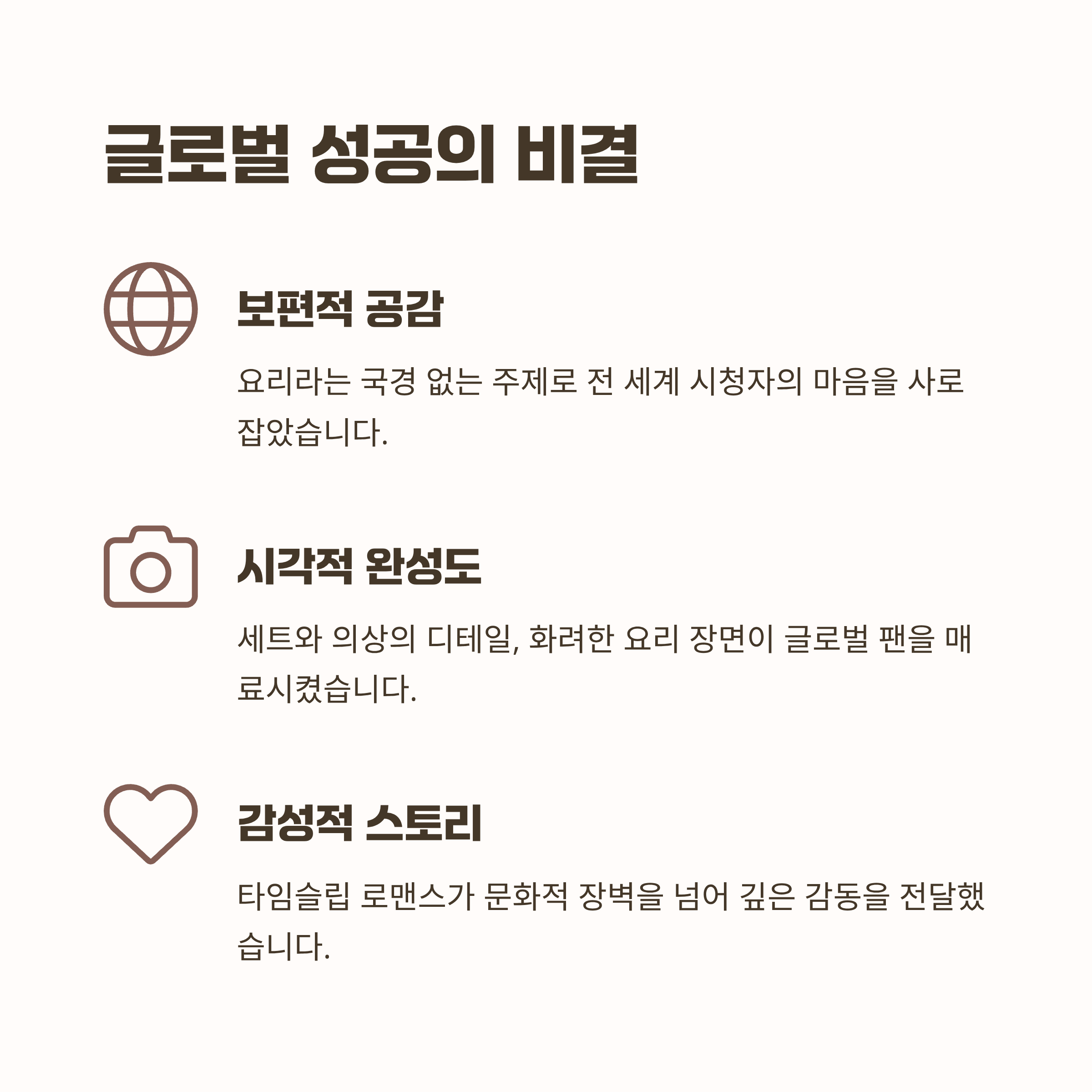 넷플릭스를 비롯한 글로벌 OTT 플랫폼에서의 성공은 드라마가 가진 세계적인 요소를 반증합니다. 요리라는 통합적이고 감성적인 주제가 국경을 넘어 쉽게 공감대를 형성한 점이 주효했습니다. 또한, 세트와 의상의 디테일, 그리고 요리 장면에서 사극 특유의 장중함과 시각적 화려함을 선보인 점도 글로벌 팬들에게 깊은 인상을 남겼습니다.