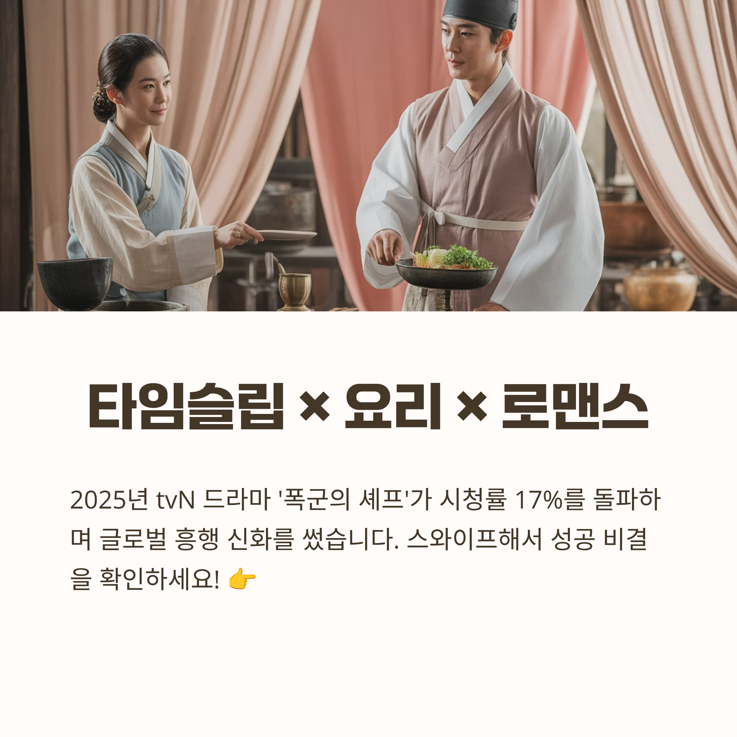 2025년 방영된 tvN 드라마 ‘폭군의 셰프’는 사극과 로맨스를 타임슬립이라는 설정과 결합한 독특한 방식으로 시청자와 평론가들의 주목을 받았습니다. 특히, 현대와 조선을 넘나드는 타임슬립 설정과 궁중 요리 및 프렌치 요리가 조화를 이루는 흥미로운 구성은 많은 이야깃거리를 제공했습니다. 높은 시청률뿐만 아니라 넷플릭스 및 글로벌 OTT 플랫폼에서도 순위 상위권을 유지하며 흥행과 인기 모두를 잡은 작품으로 평가받고 있습니다.