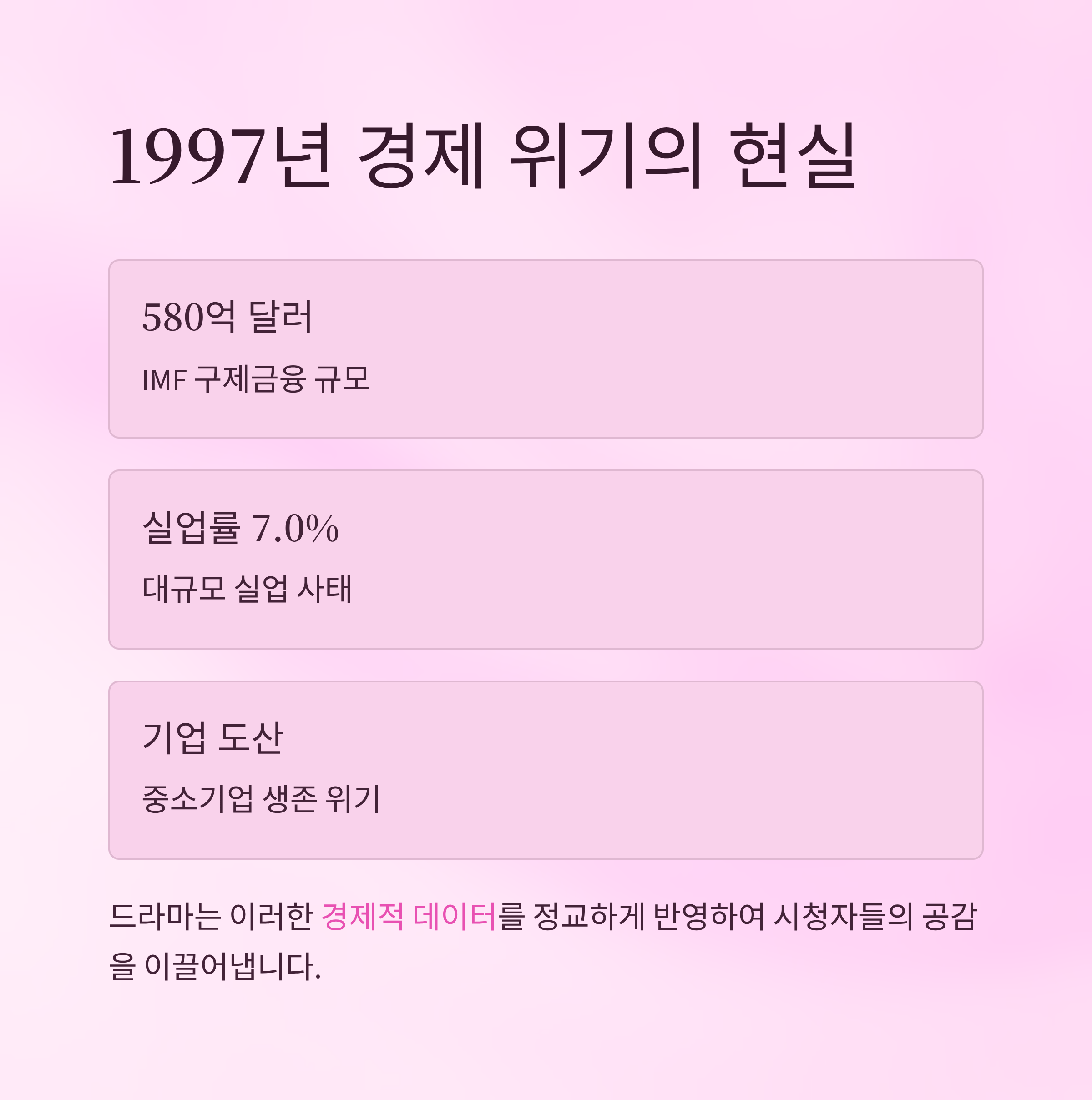 ‘태풍상사’는 단순히 청년 사업가의 성공기를 그리지 않고, 1997년 IMF 외환위기라는 실제 역사적 현실을 정교하게 반영했습니다. 당시 경제 위기 속의 기업 도산, 대규모 실업률 상승 그리고 중소기업의 생존 문제 등 시대적 아픔을 드라마틱하게 구현하여 시청자들의 감정적 공감을 이끌어냈습니다. 경제적 데이터(580억 달러 구제금융, 실업률 7.0% 등)를 극 중 사건에 활용하며, 그 정밀함에서 호평을 받고 있는 점은 이 드라마의 독창적인 성과로 평가됩니다.