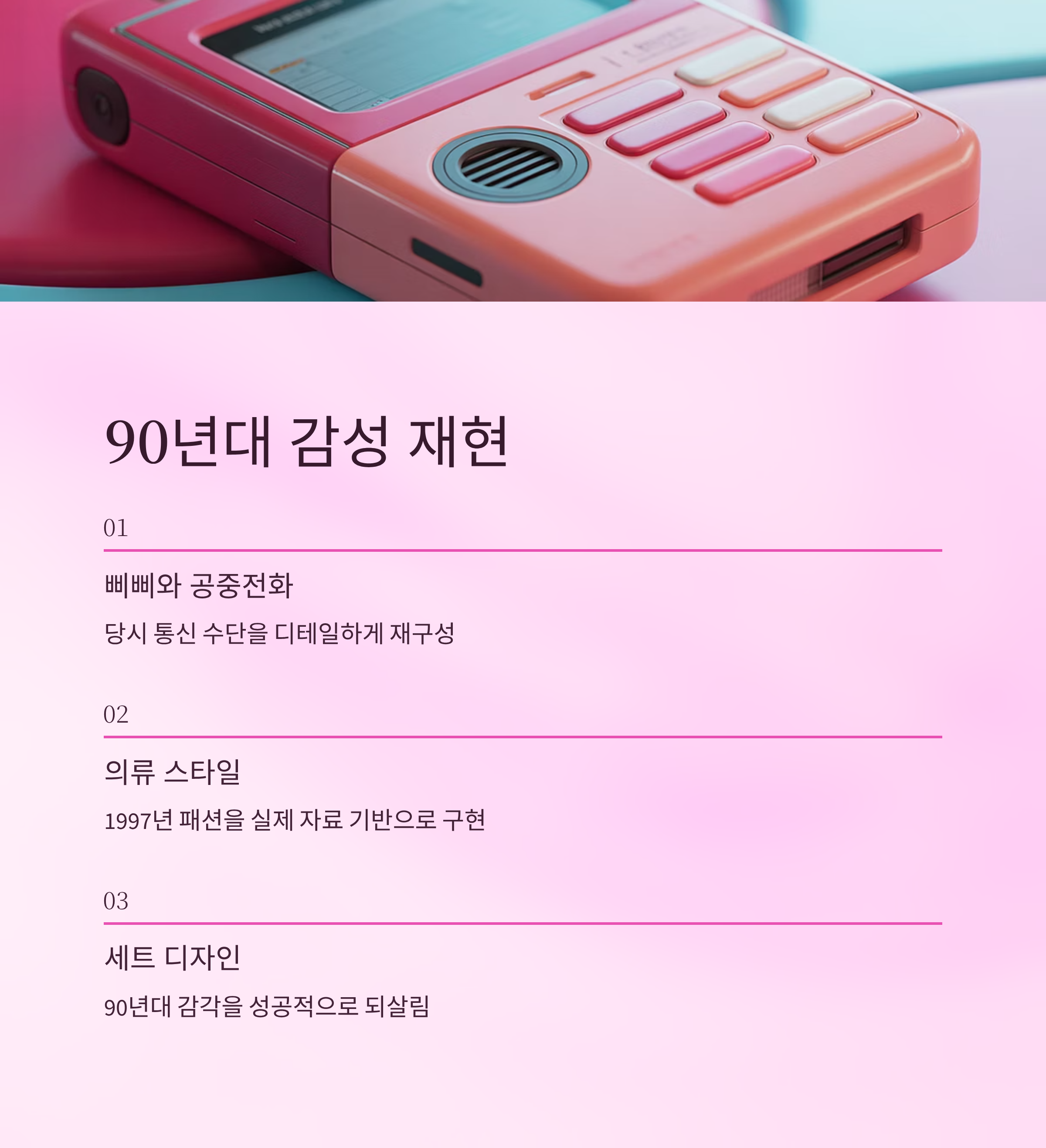 | A. 삐삐, 공중전화, 당시 의류 스타일 등은 제작진이 실제 자료나 1997년 한국 내 기록을 바탕으로 디테일하게 재구성해 리얼리티를 살렸습니다. |