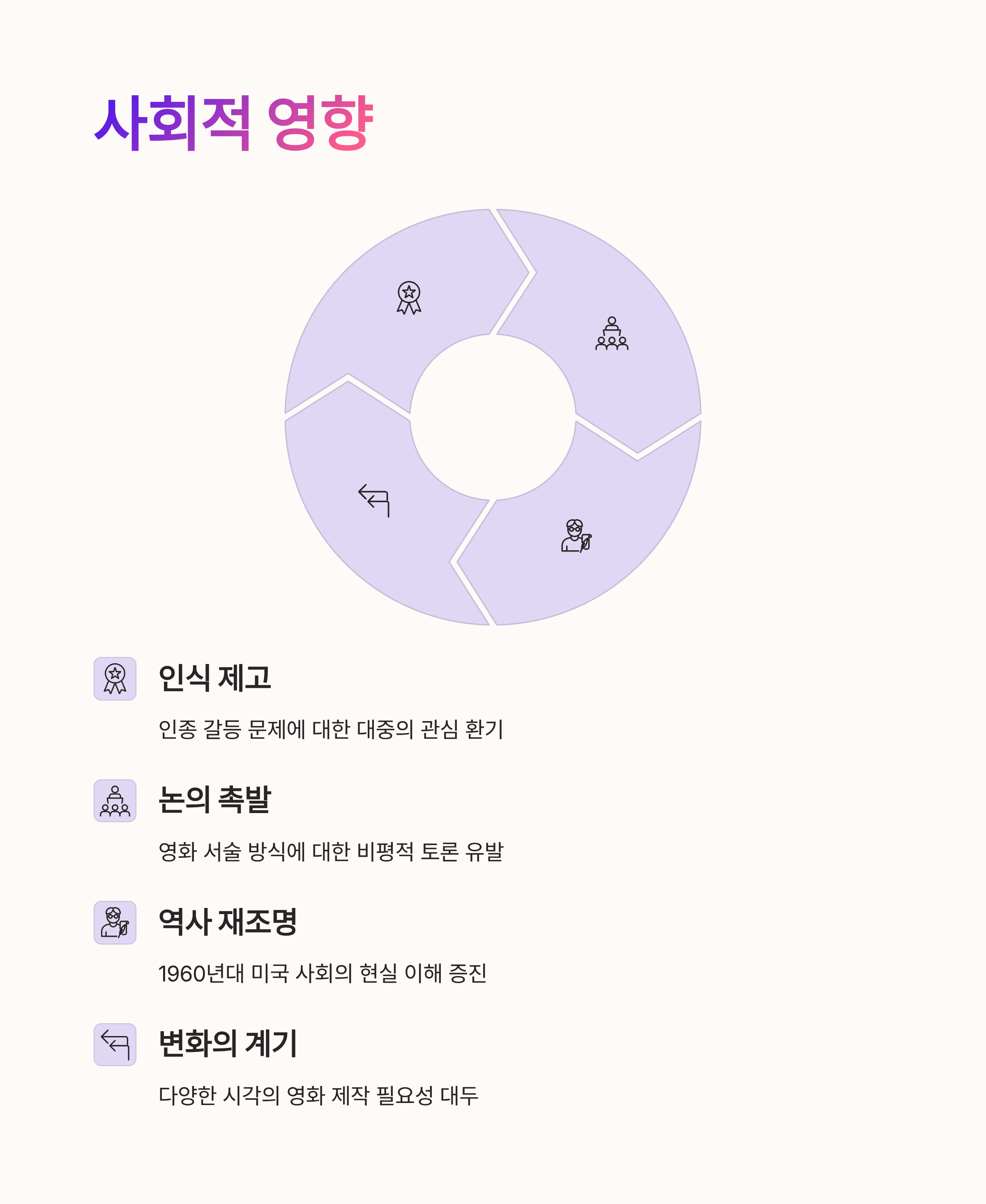 앞으로 이와 비슷한 주제를 다루며 보다 현실적으로, 또 다양한 시각에서 모든 인종의 주체성을 담아내는 영화들이 제작되기를 바랍니다. 이를 통해 예술이 실제 사회 변화를 이끄는 강력한 계기로 작용할 수 있을 것입니다.