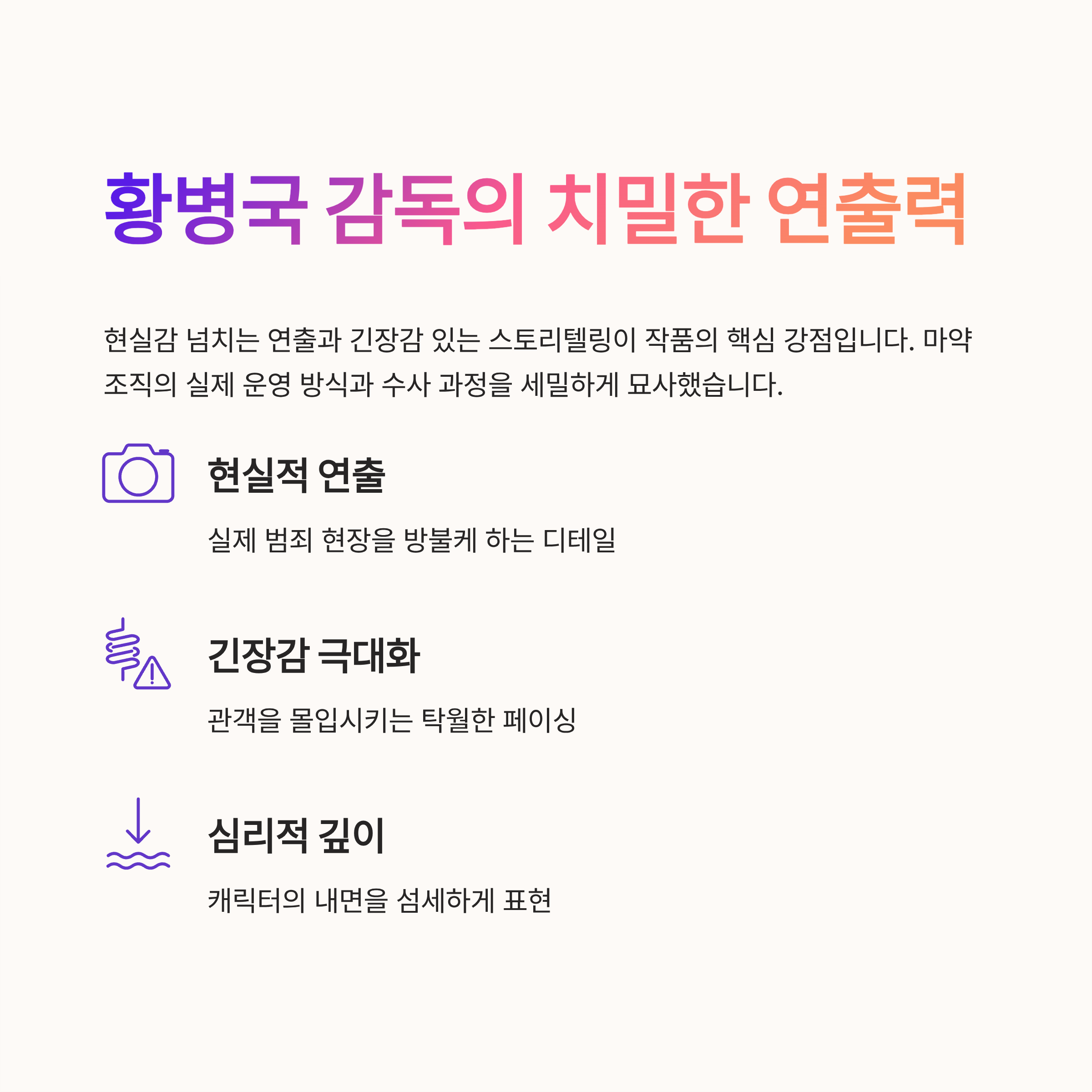 4. 마약 조직과 수사기관의 복잡한 얽힘을 바탕으로 한 현실감 넘치는 연출이 주요 강점으로 꼽힙니다.