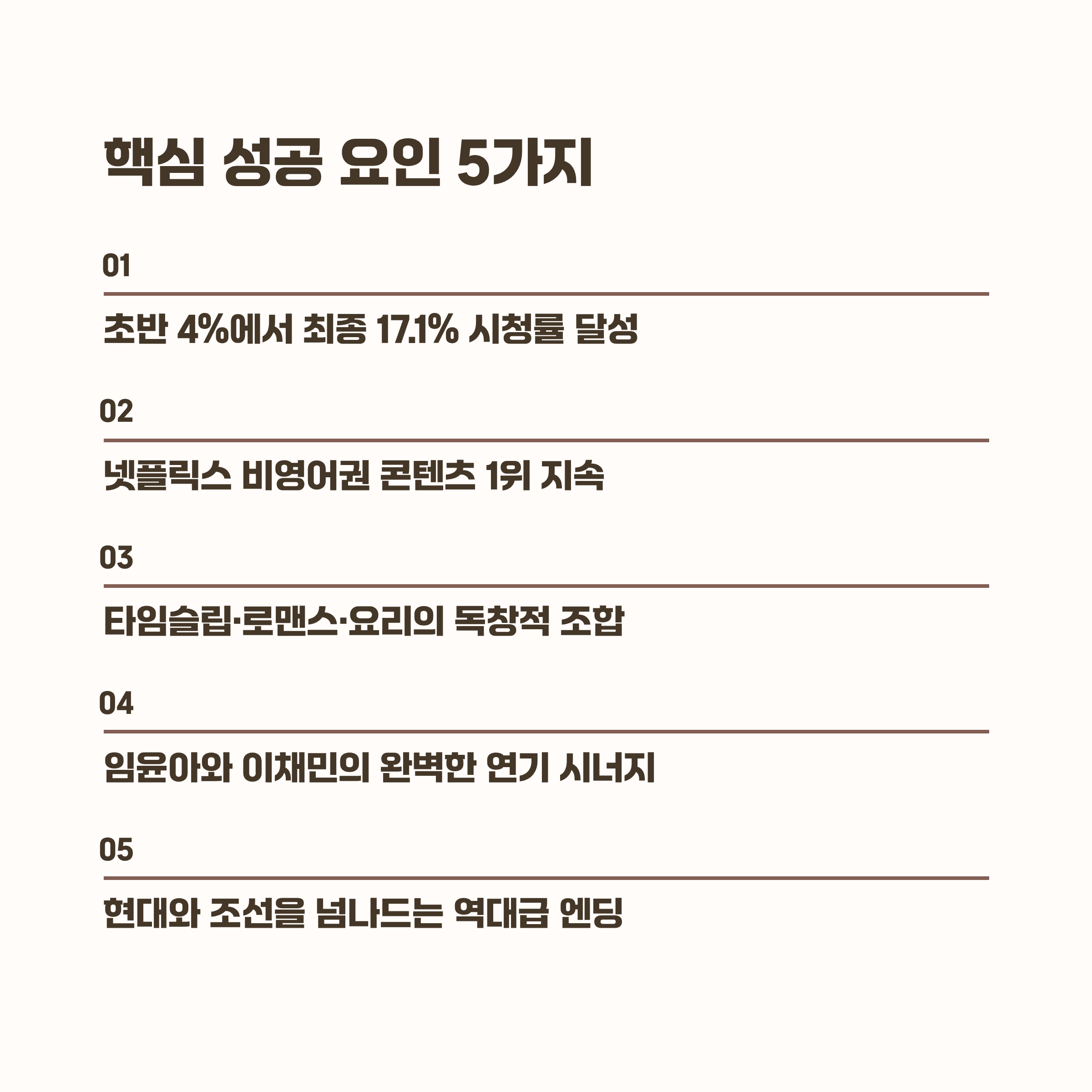 주요 줄거리는 현대의 미슐랭 3스타 셰프 연지영(임윤아)이 뜻밖의 사고로 조선 시대로 넘어가게 되면서 시작됩니다. 그곳에서 만난 연희군(이채민)과의 갈등과 협력, 그리고 새롭게 발견되는 사랑의 감정이 중심을 이루며, 요리라는 독특한 매개체로 두 인물이 소통하고 성장하는 과정을 다루고 있습니다. 무엇보다 연연히 17%라는 높은 시청률을 기록한 것은 작품의 스토리 구조와 연기, 그리고 글로벌 팬이 공감할 수 있는 보편적인 매력이 있었기 때문입니다.