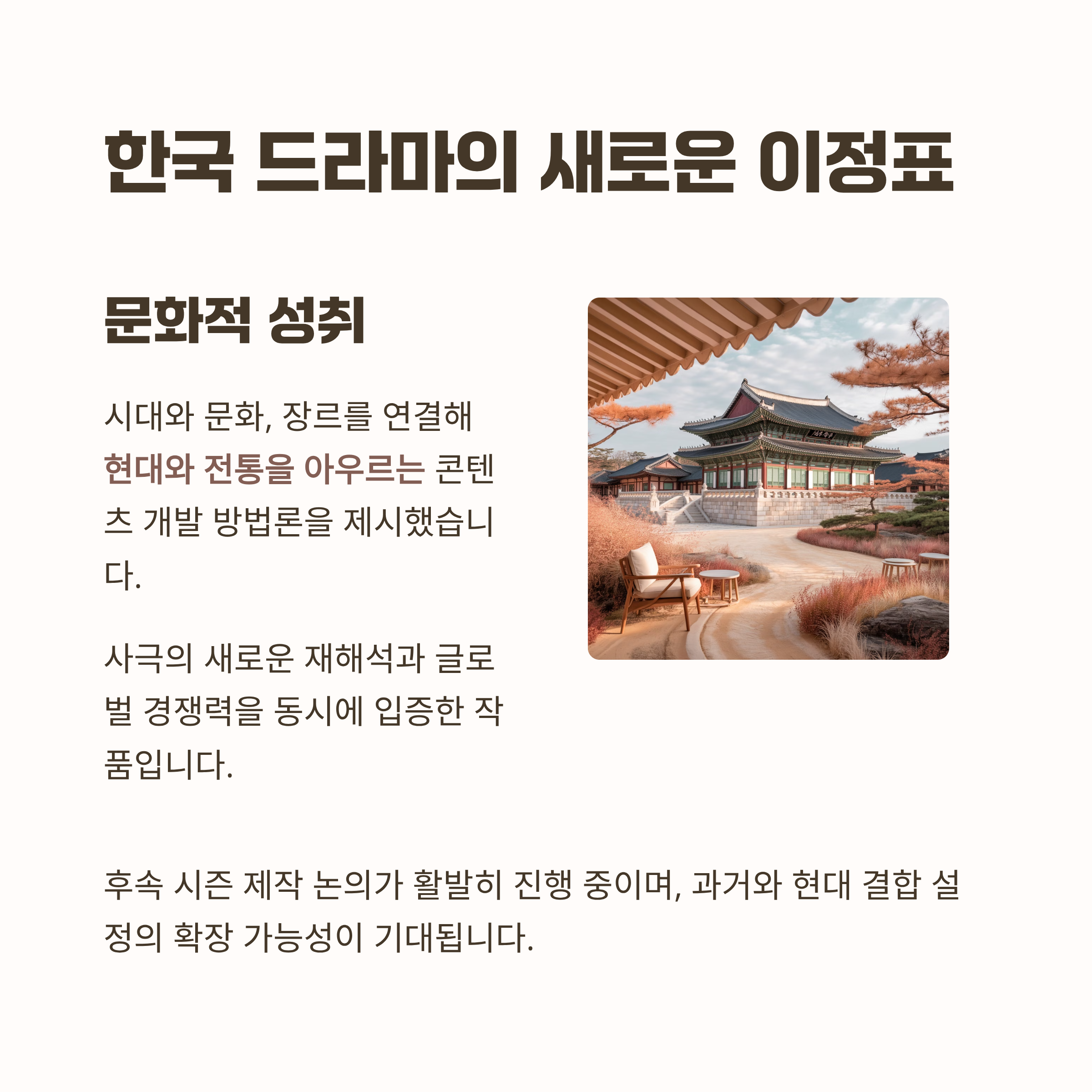 '폭군의 셰프'는 단순히 시청률 면에서의 성공뿐 아니라, 스토리와 캐릭터, 그리고 문화적 메시지 측면에서 큰 성취를 이뤘습니다. 타임슬립이라는 장르적 요소를 새롭게 재해석하고, 요리라는 글로벌 공감을 유도할 수 있는 주제와 결합해 대중성과 전문성을 동시에 잡은 작품으로 자리 잡았습니다. 드라마는 기존 사극과는 차별화를 시도하면서도 시대적 사실을 기반으로 한 허구적 상상력을 치밀하게 결합하여 깊은 공감을 이끌어냄으로써 국제적인 화제를 모았습니다. 이처럼 시대와 문화, 장르를 연결해 현대와 전통을 아우르는 콘텐츠 개발은 향후 한국 드라마가 해외에서도 경쟁력을 가질 방법론을 제시한 사례로 평가할 수 있습니다.